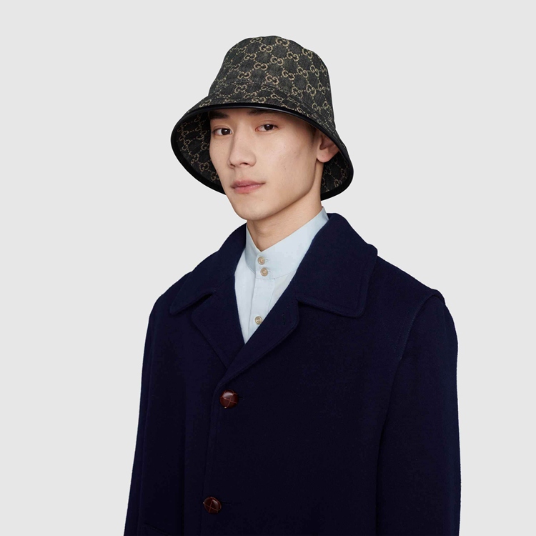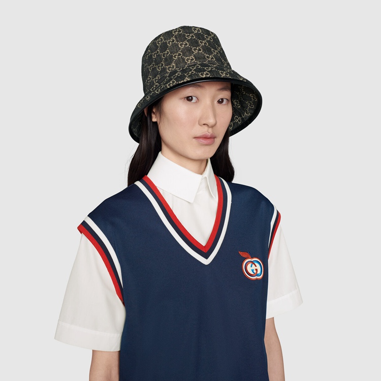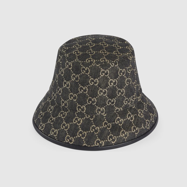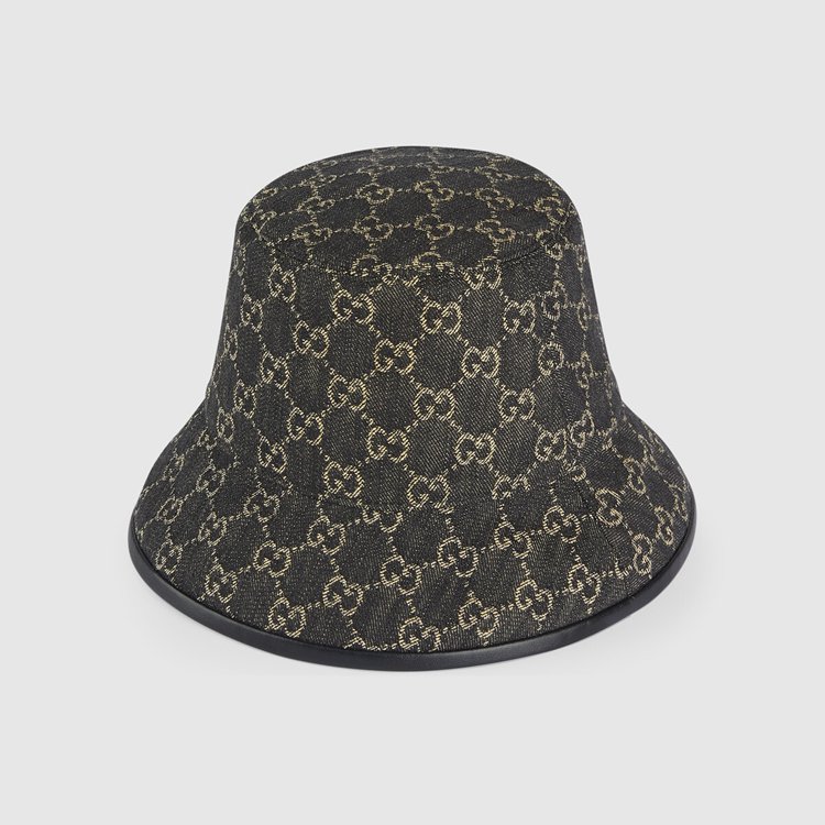 Style 576371 3HAF8 1060An evolution of The original Gucci rhombi design from The ’30s, The pattern is now an established emblem of The brand’s heritage. This bucket hat is constructed from black and ivory GG denim, completed by a black leather trim.