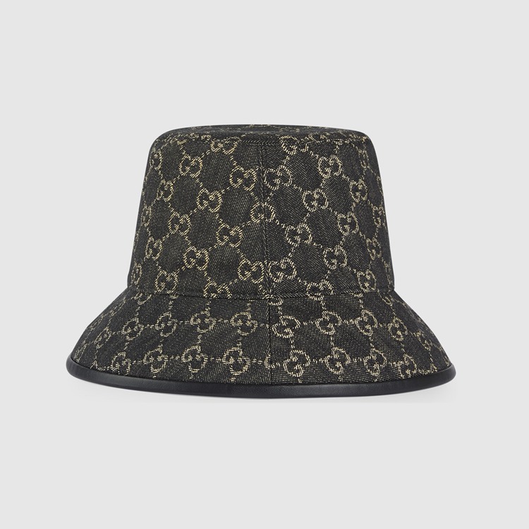 Style 576371 3HAF8 1060An evolution of The original Gucci rhombi design from The ’30s, The pattern is now an established emblem of The brand’s heritage. This bucket hat is constructed from black and ivory GG denim, completed by a black leather trim.