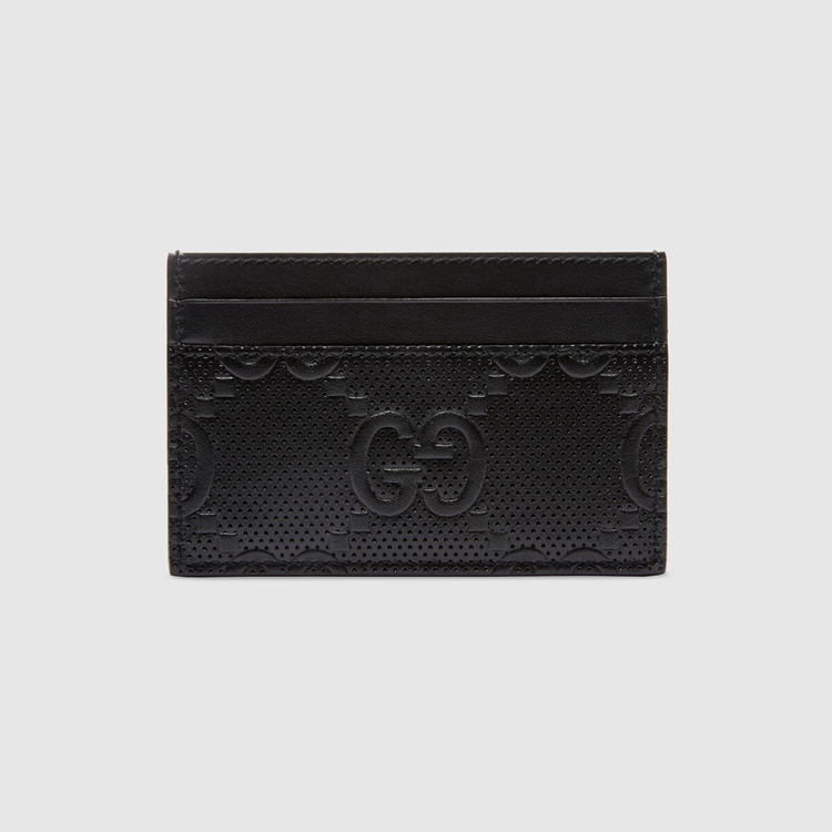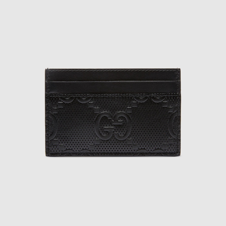 Style 625564 1W3AN 1000 The leather card case is introduced in a New interpretation of The GG motif presented Within The Pre-Fall 2020 collection. Noted For its softness and slightly shiny finish, The GG leather plays on texture, embossing The House emblem onto a black perforated leather base.