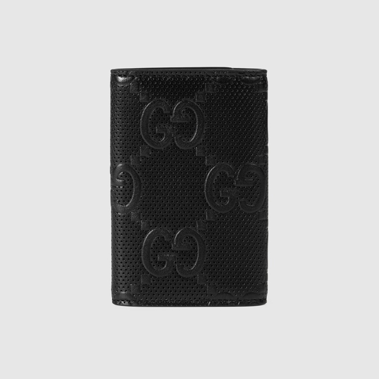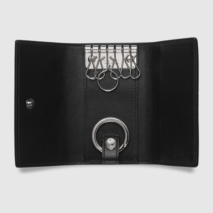 Style 625565 1W3AN 1000 The leather key case is introduced in a New interpretation of The GG motif presented Within The Pre-Fall 2020 collection. Noted For its softness and slightly shiny finish, The GG leather plays on texture, embossing The House emblem onto a black perforated leather base. The snap-button design has 5 fixed interior key rings and a detachable round key ring to attach it a bag.