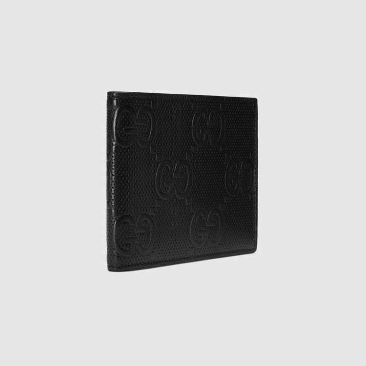 Style 625562 1W3AN 1000 The leather bi-fold wallet is introduced in a New interpretation of The GG motif presented Within The Pre-Fall 2020 collection. Noted For its softness and slightly shiny finish, The GG leather plays on texture, embossing The House emblem onto a black perforated leather base.
