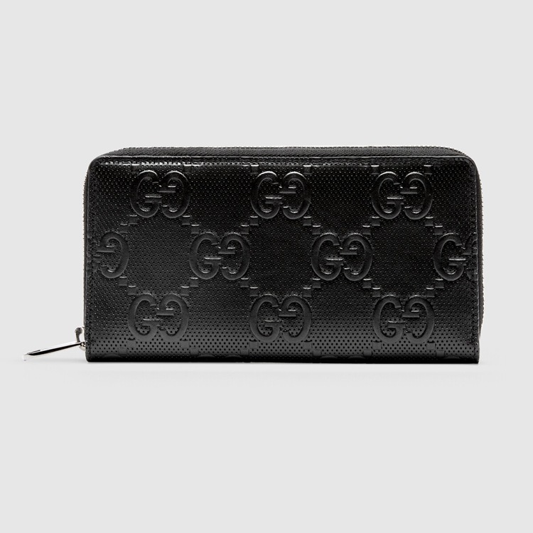 Style 625558 1W3AN 1000 The leather zip around wallet is introduced in a New interpretation of The GG motif presented Within The Pre-Fall 2020 collection. Noted For its softness and slightly shiny finish, The GG leather plays on texture, embossing The House emblem onto a black perforated leather base.
