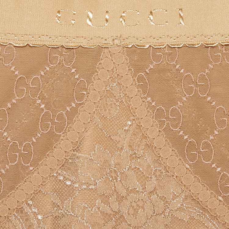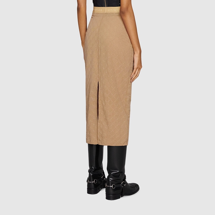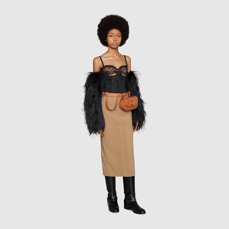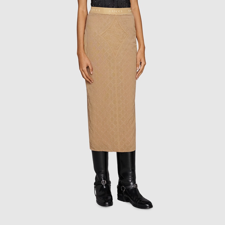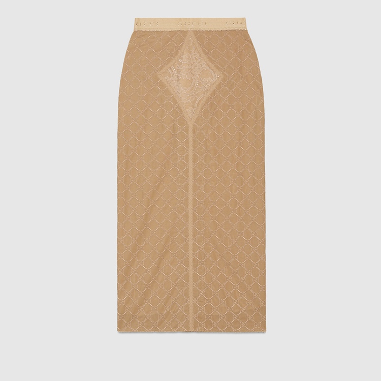 Style 678366 XUACW 2154 For The Gucci Aria collection, Typical lingerie silhouettes are re-imagined as unconventional ready-to-wear pieces, exploring The concept of fashion as a means of self-expression. Crafted from beige GG embroidered heavy tulle, an elastic waistband With Gucci logo completes The skirt.