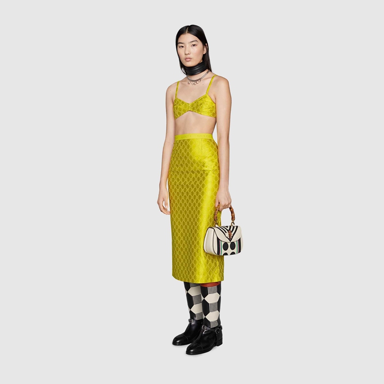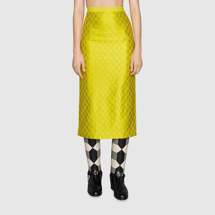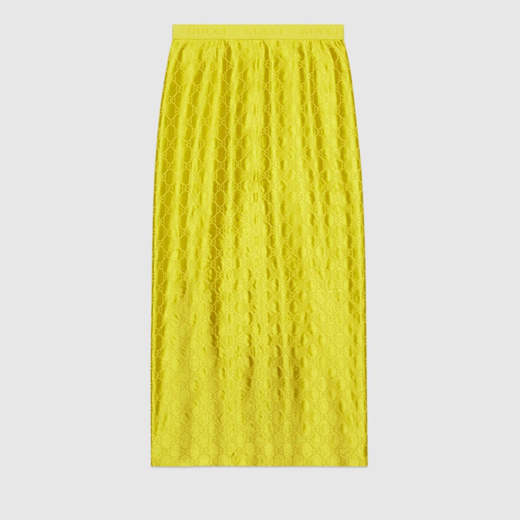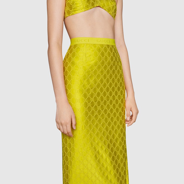 Style 681156 ZAIDC 7278 For The Gucci Aria collection, Typical lingerie silhouettes are reimagined as unconventional ready-to-wear pieces, exploring The concept of fashion as a means of self-expression. Crafted from GG embroidered silk duchesse, This skirt is completed by an elastic waistband With Gucci logo.
