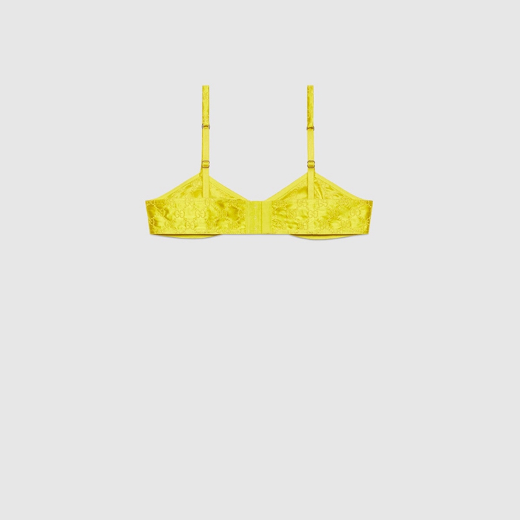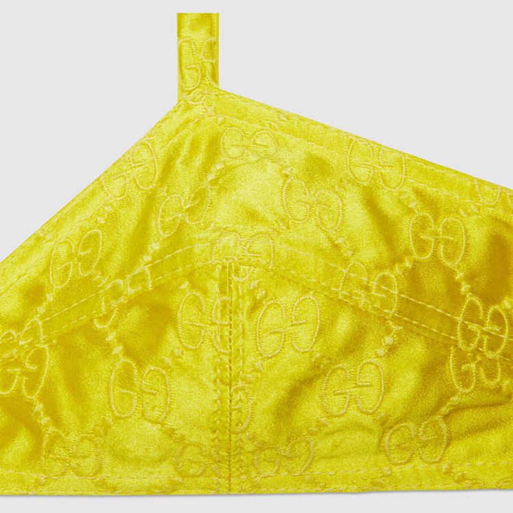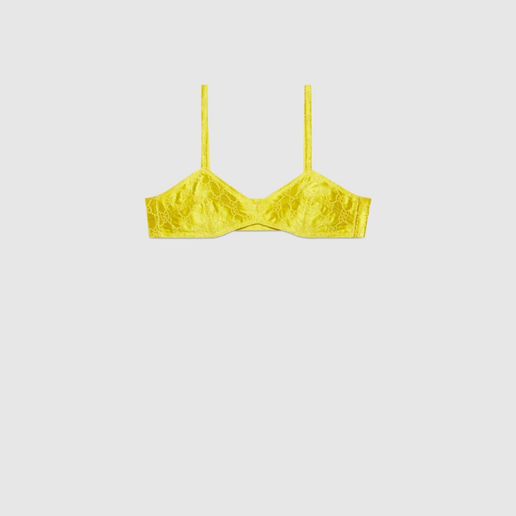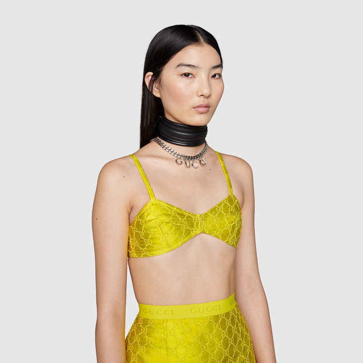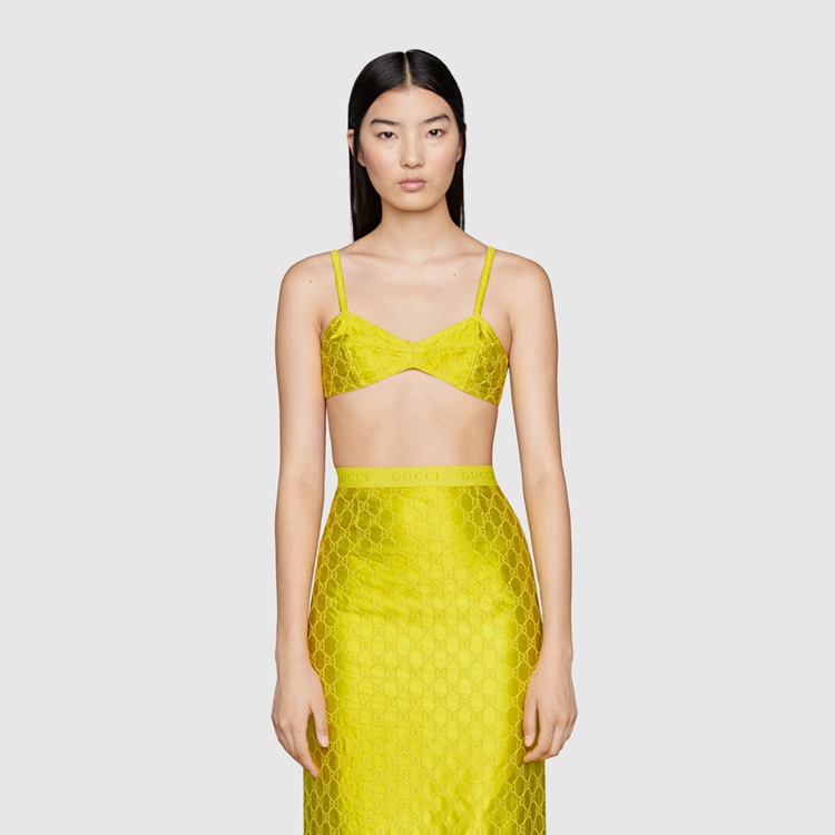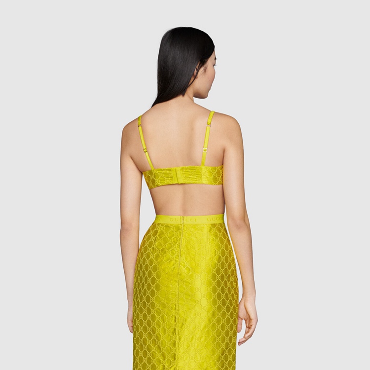 Style 681155 ZAIDC 7278 For The Gucci Aria collection, Typical lingerie silhouettes are reimagined as unconventional ready-to-wear pieces, exploring The concept of fashion as a means of self-expression. This top Crafted from GG embroidered silk duchesse is presented in a blow shade of yellow.