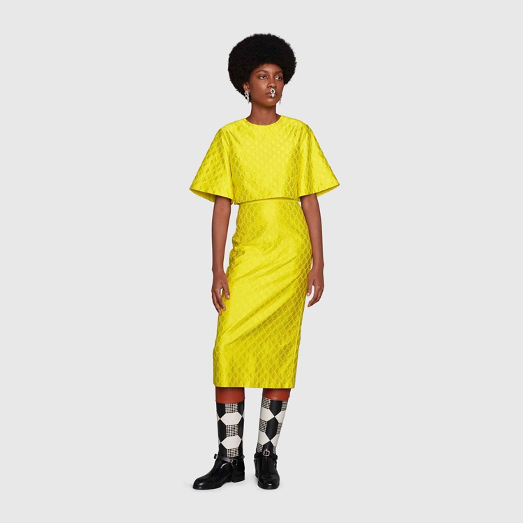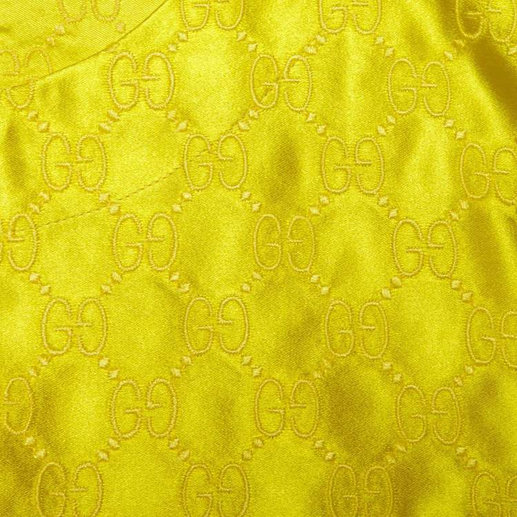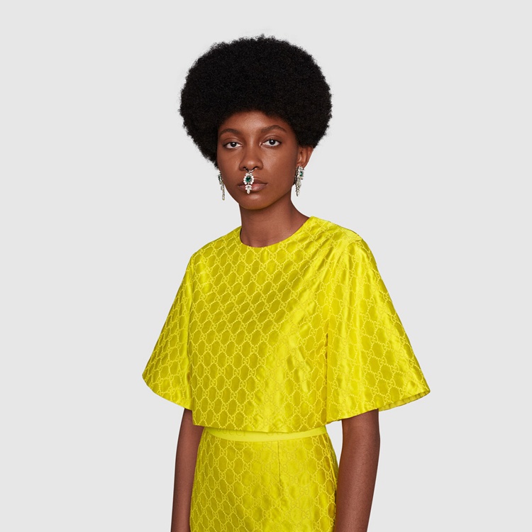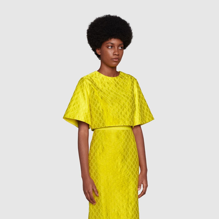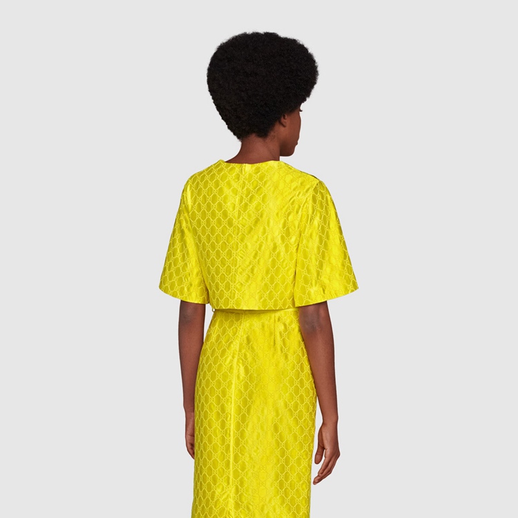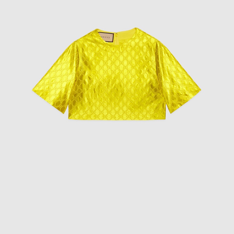 Style 681569 ZAIDC 7278 Gucci Aria is an ode to both The traditional and The contemporary nature of The House. Symbols that have defined different eras appear as recognizable logos that connect The past and present. This silk top plays With Gucci’s Emblematic GG motif by pairing it With a cropped silhouette and vibrant shade of yellow.