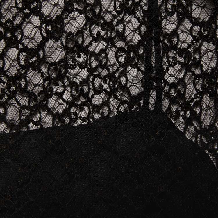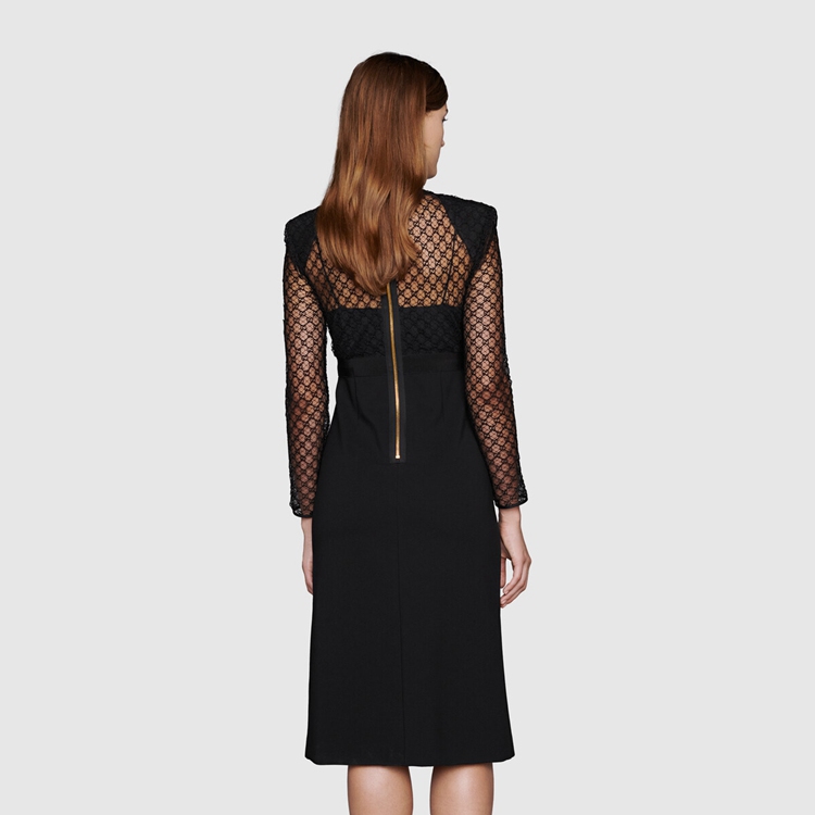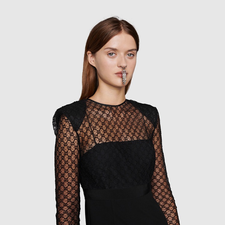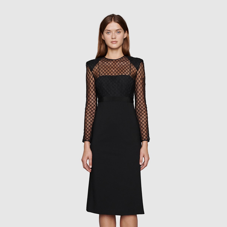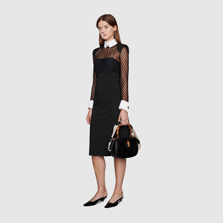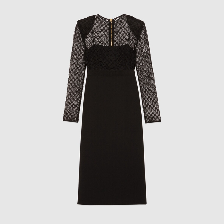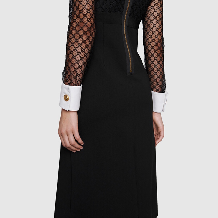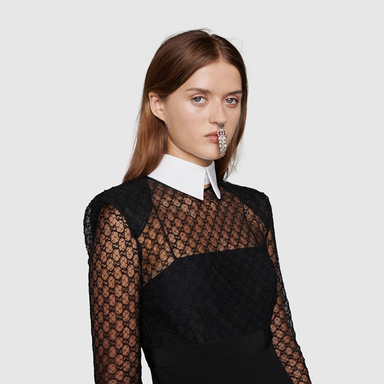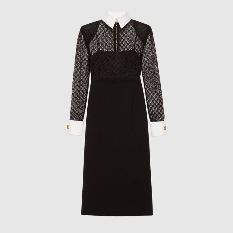 Style 678693 XJDYO 1043 Crafted from black viscose and GG embroidered tulle, This black dress is enriched With detachable collar and cuffs. This season, For The first time, Alessandro Michele presents a series of completely black looks, The styles are composed of see-through or cropped Designs finished With unambiguous sensuality.