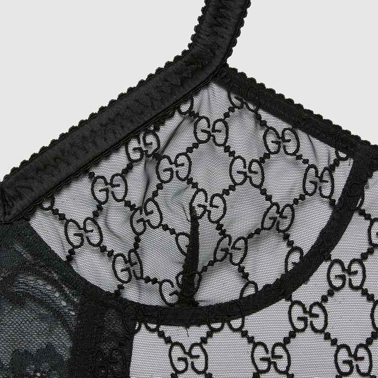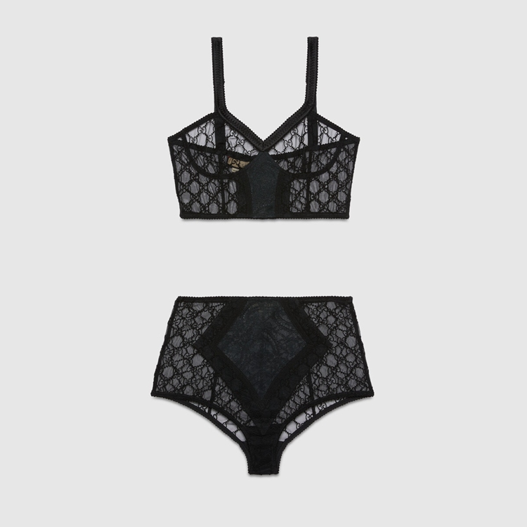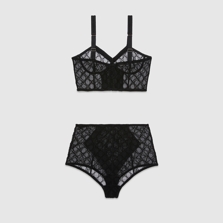 Style 671951 XUADV 1000 Crafted from black embroidered GG tulle, This lingerie set embodies what The Creative Director described as a “beautiful cliché of sexiness,” a concept explored throughout The latest collections With hints to The idea of freedom that fashion experienced in The ’90s.