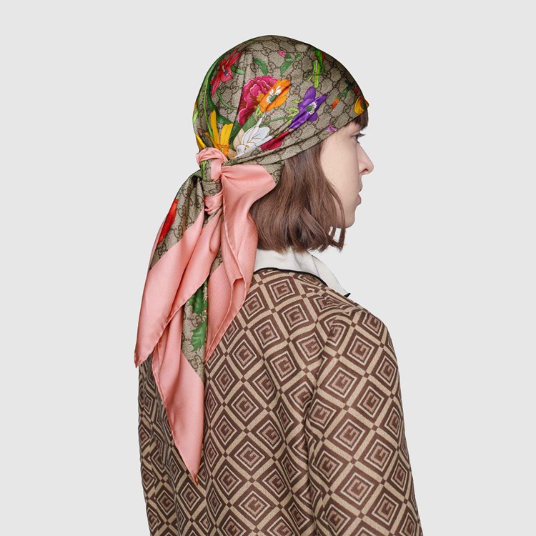 Style 602585 3G001 9772 Part of a special collection With pastel-hued accents, This silk scarf combines two of The House’s most distinctive designs. The historic Flora motif, first presented by Vittorio Accornero in The ’60s, is layered over The House monogram For a modern take on The two archival patterns.