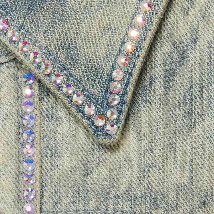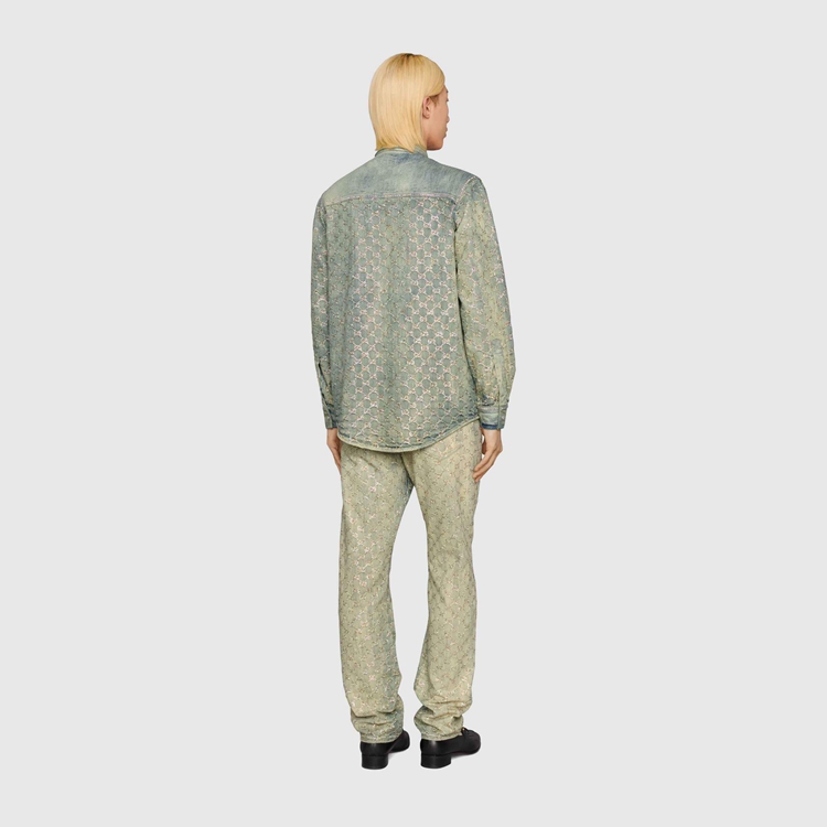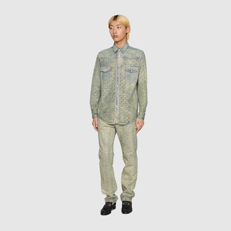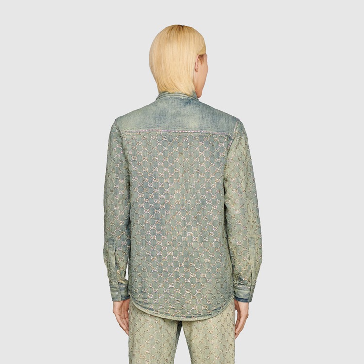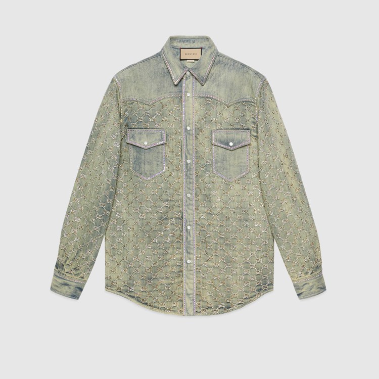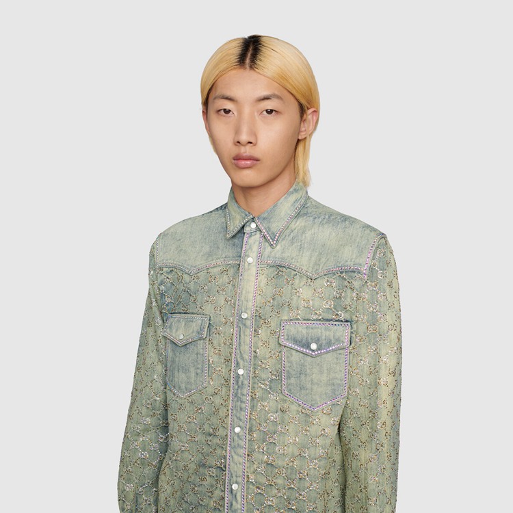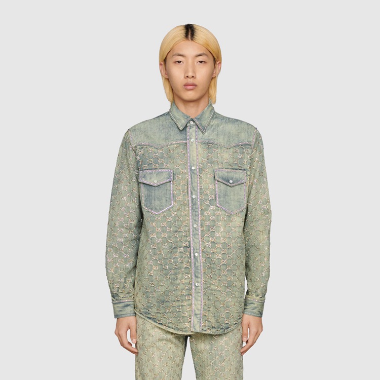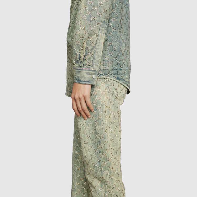 Style 669613 XDBSD 4452 A strong logo feel is woven throughout The collection in an exploration of The possibility Within versatility. Embodying This theme is a range of reimagined GG jacquard denim pieces across The ready-to-wear collection. The quintessentially Gucci motif, first used in The 1970s, elevates This cult fabric in unexpected ways. Here, The monogram defines This denim shirt and The style is further enhanced by crystal detail that purposely doesn’t follow The GG pattern.