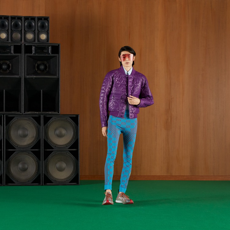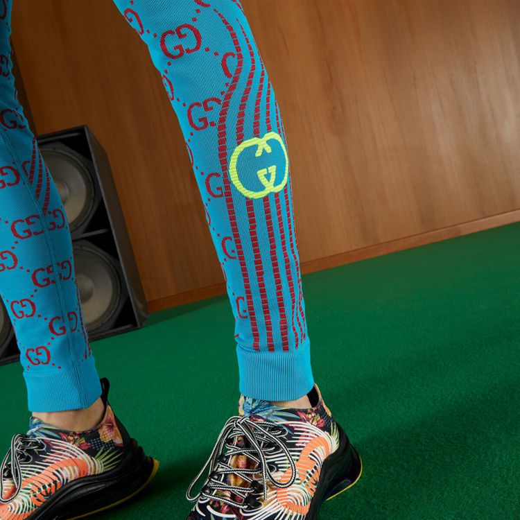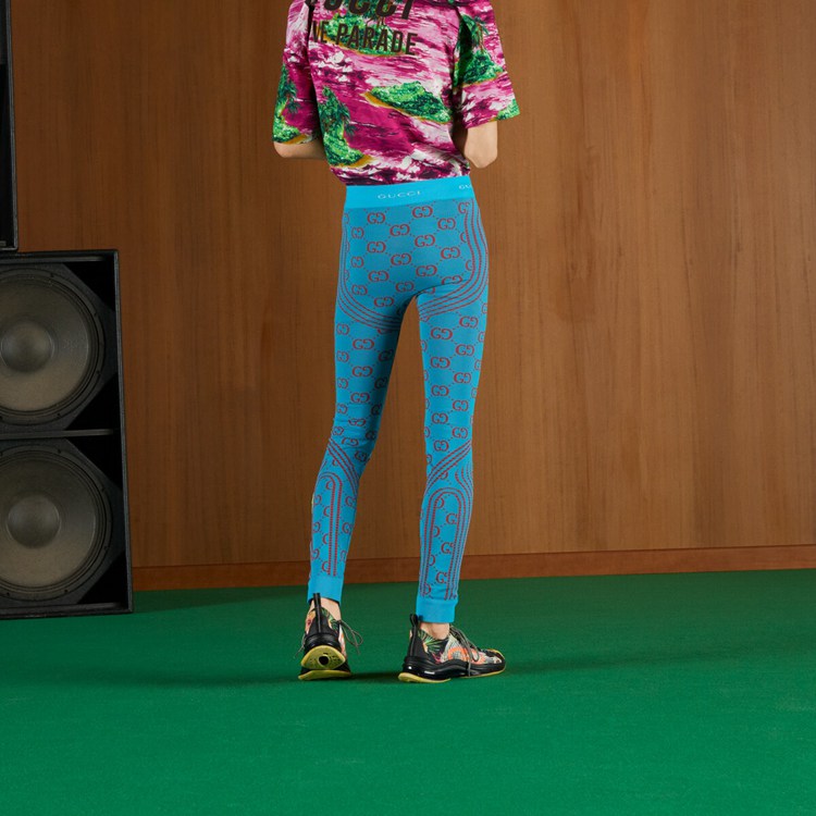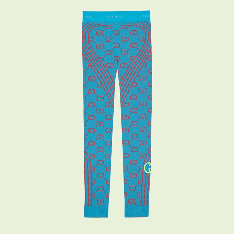Style 693102 XJEAE 4589 A pair of turquoise and red GG jacquard leggings. Paying homage to The city that created a fascination With The movie industry and pop culture, Gucci Love Parade takes inspiration from Hollywood’s glamour. Influenced by relaxed outfits of celebrities out and about, The collection balances contemporary layering of casual garments With sartorial ones.