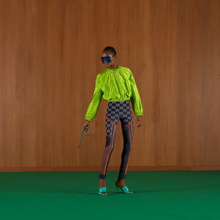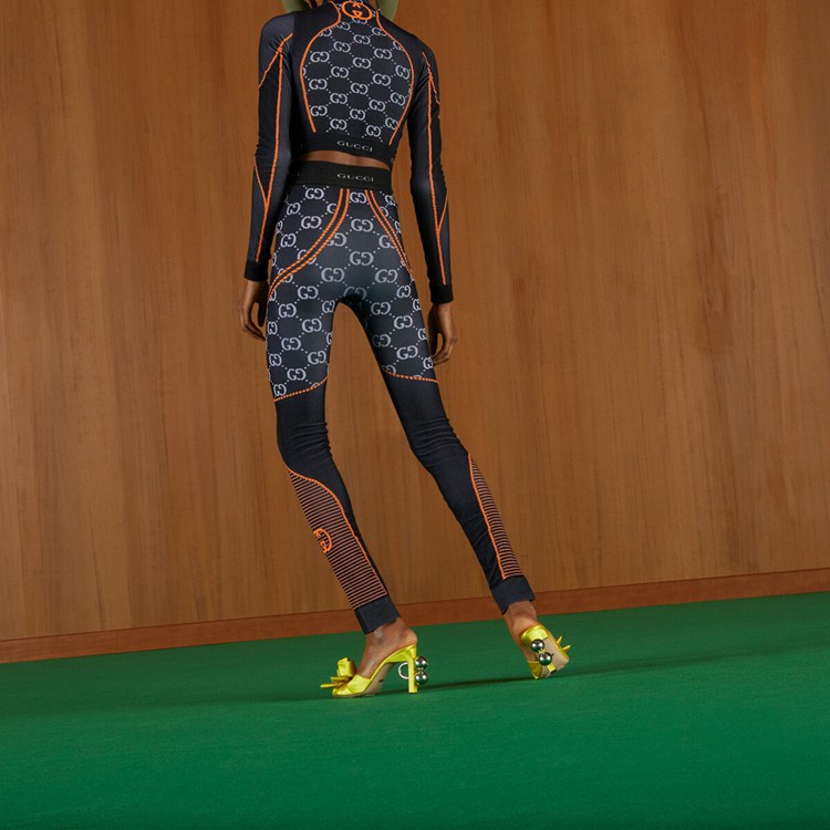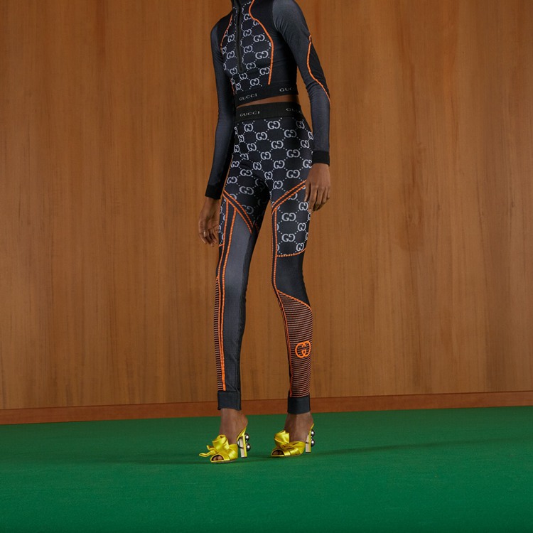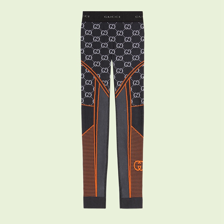 Style 689203 XJEFV 1117 Part of Gucci Love Parade collection, This pair of leggings is Crafted from black and orange GG jersey jacquard. In a continuation of The House’s aesthetic, sportswear- Inspired pieces take on a New meaning. Bright-colored pieces like GG monogram leggings and stretchy tops are seen throughout The collection, mixing With The understated elegance of The sartorial world.