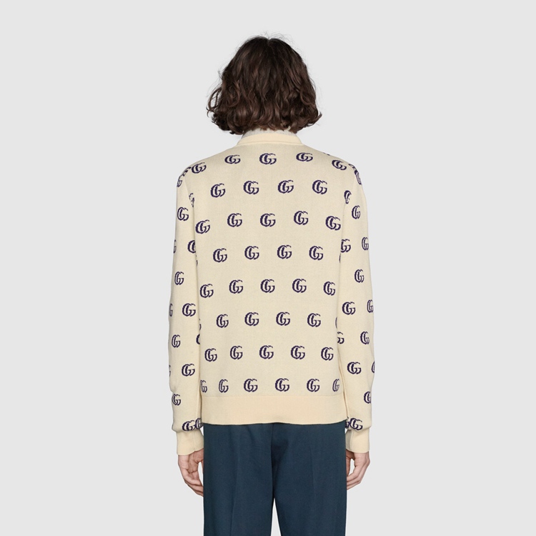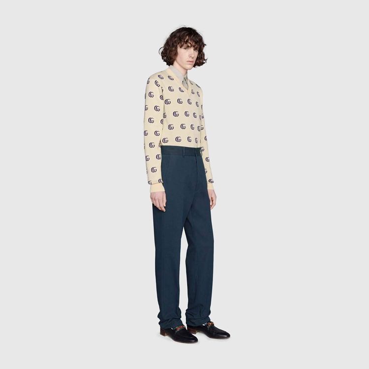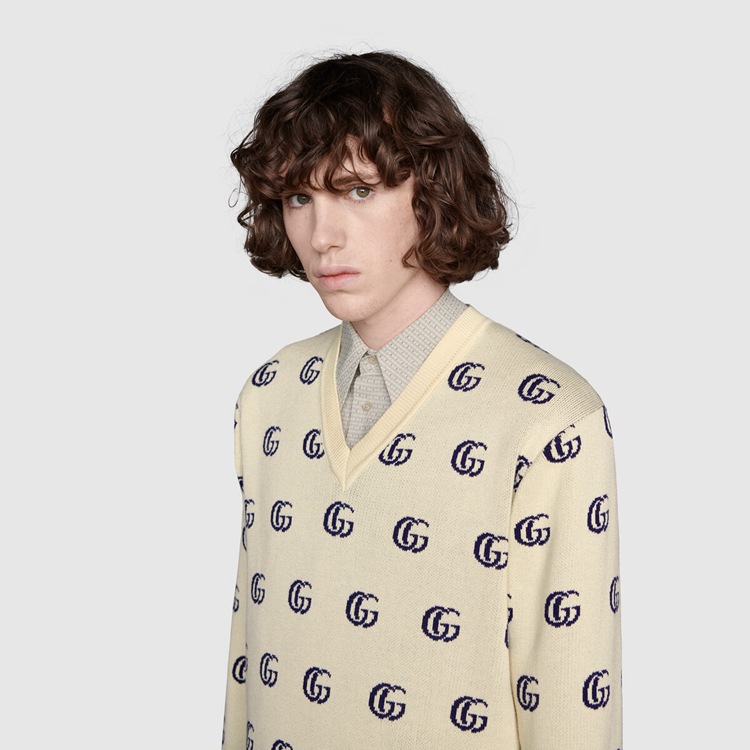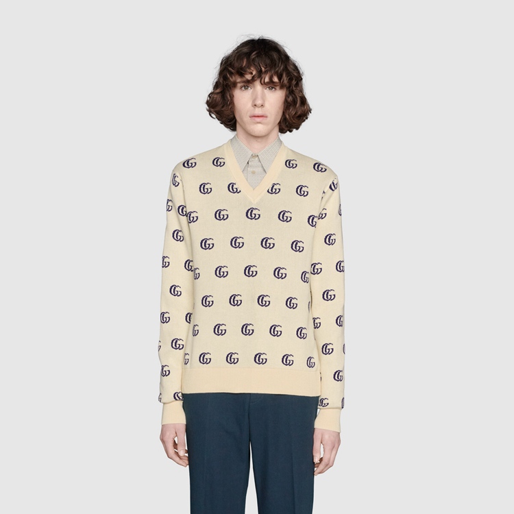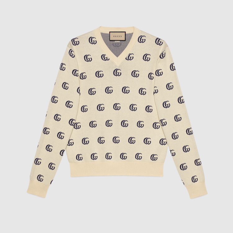 Style 655104 XKBVB 9071 Part of The House’s codes first presented during The ‘30s, The distinctive GG motif has been The inspiration For New explorations of expression For almost a century. In a New interpretation, The GG is presented as a jacquard on This cotton V-neck sweater.