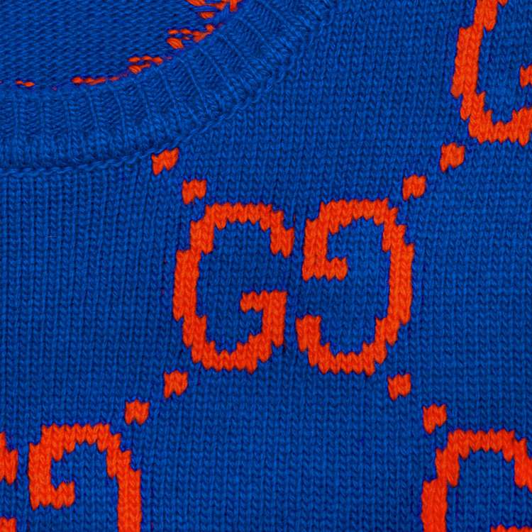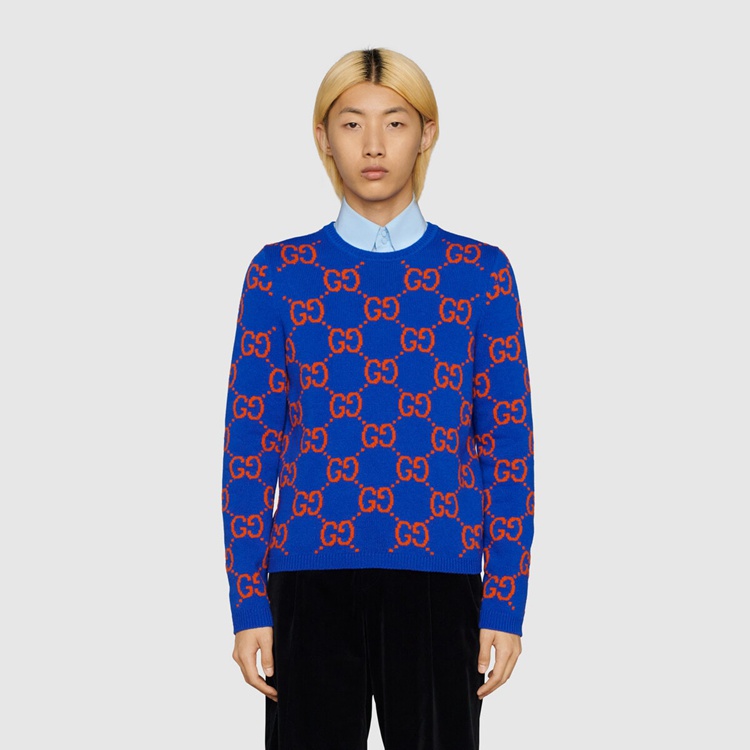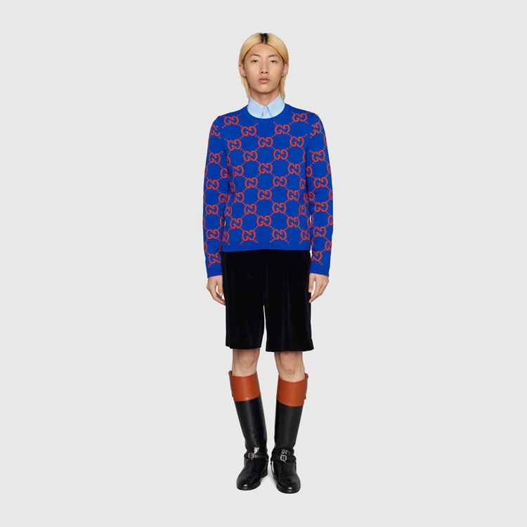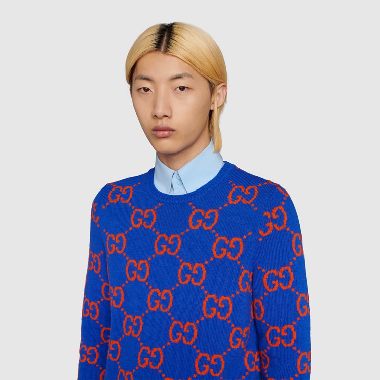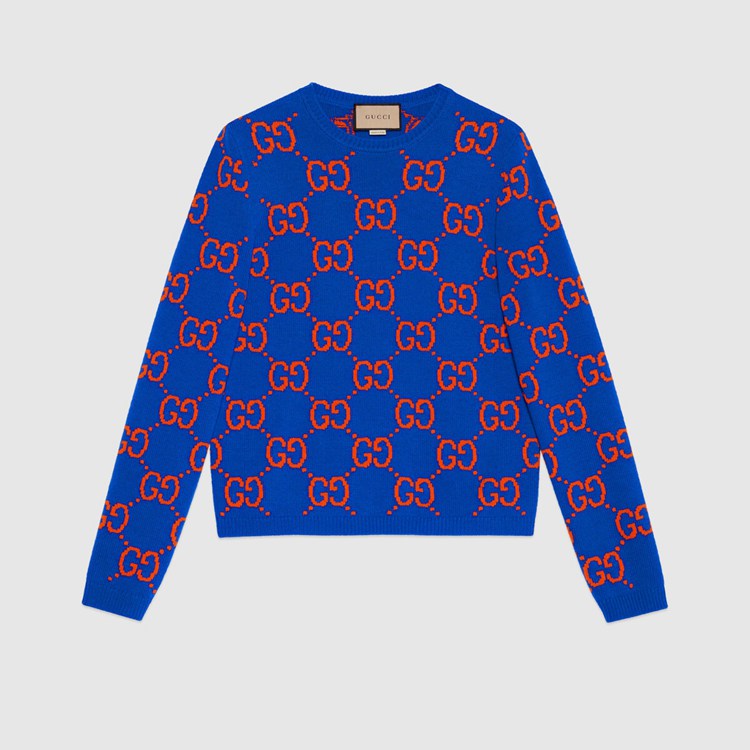 Style 674042 XKB3V 4370 A colorful interpretation of The signature GG motif defines This blue wool sweater. The historic monogram—a nod to The House’s Founder Guccio Gucci, appears here in red, adding chromatic contrast to The vibrant design.