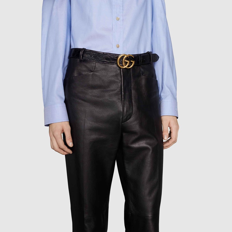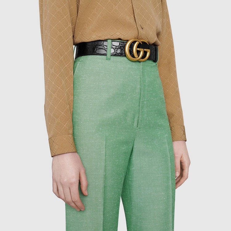Style 406831 E7I0G 1000 The Emblematic Double G is reintroduced For Spring Summer 2020 in a luminous gold-tone, set on a men’s black crocodile leather belt.