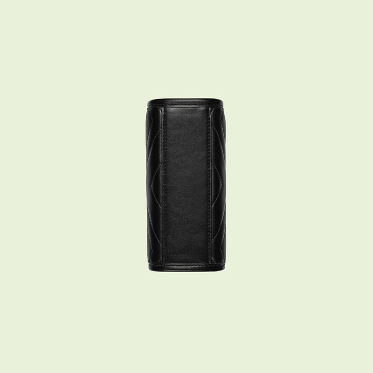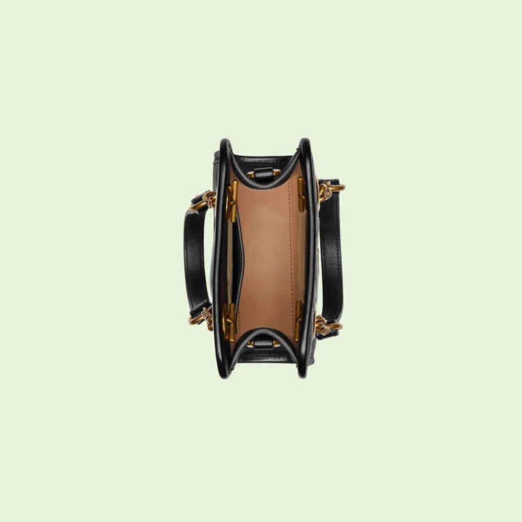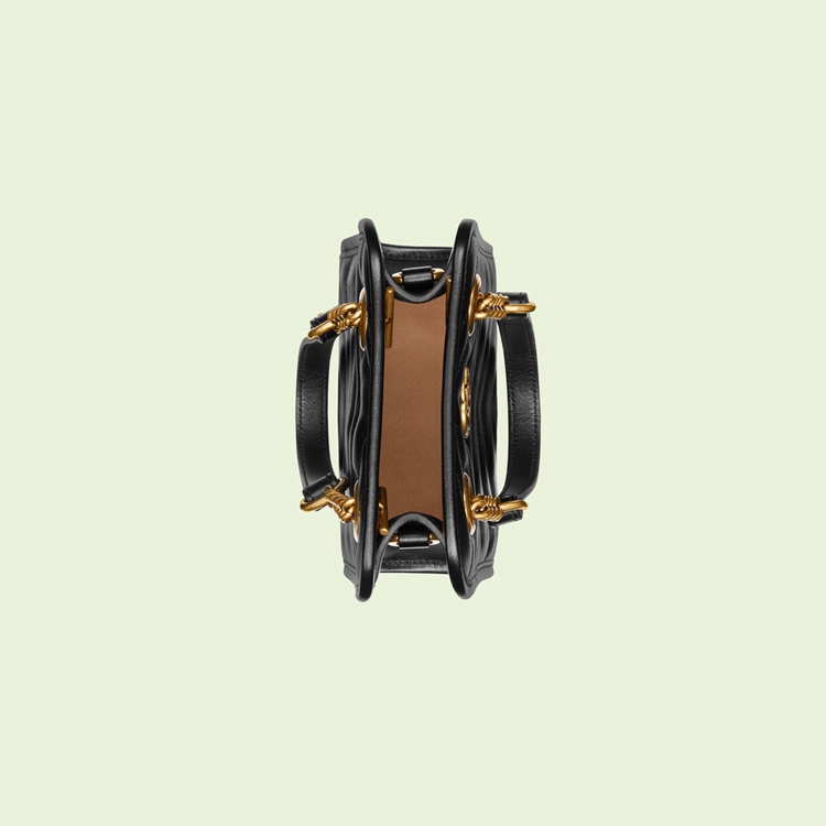 Style 696123 DTDHT 1000Reminiscent of The ’90s trend, Gucci Love Parade sees recognizable elements of The House playfully presented in miniature. With a softly structured rectangular shape, This GG Marmont is made from black matelassé leather and completed by petite Double G hardware. Allowing The accessory to be styled in different ways, The accessory has both double handles and a removable leather strap.