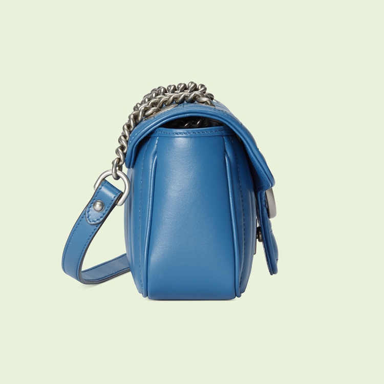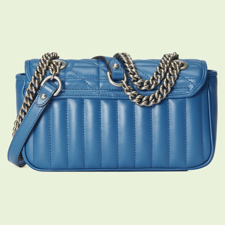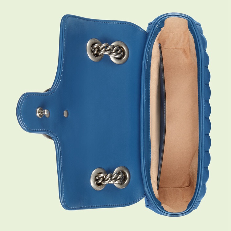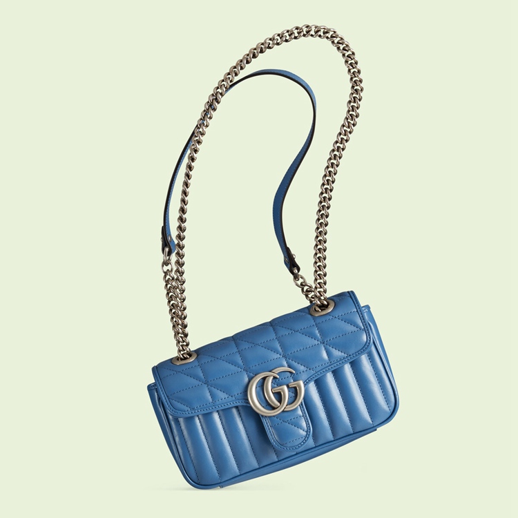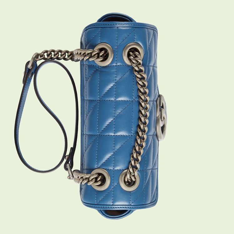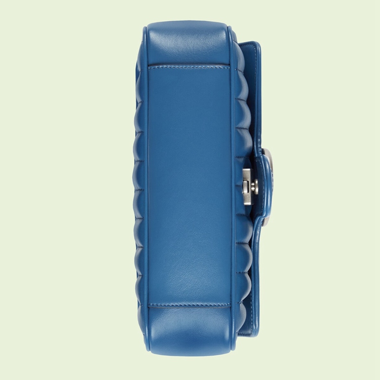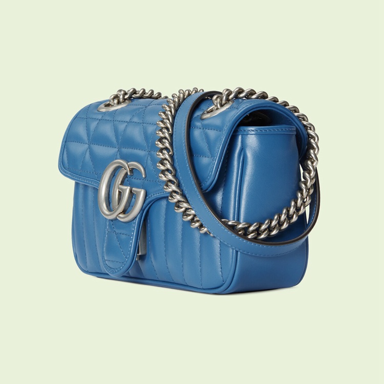 Style 446744 UM8AF 4340 The GG Marmont is reimagined through eye-catching New shades and textures. A recognizable member of The Beloved lines, The line is defined by its Double G hardware and matelassé leather. As a Part of Gucci Love Parade, a New iteration of The line is introduced in blue With two different quilted geometric motifs. The mini shoulder bag is completed by silver-toned Double G hardware.