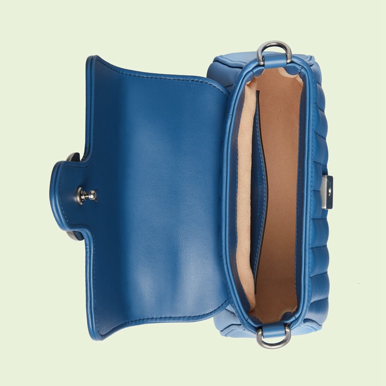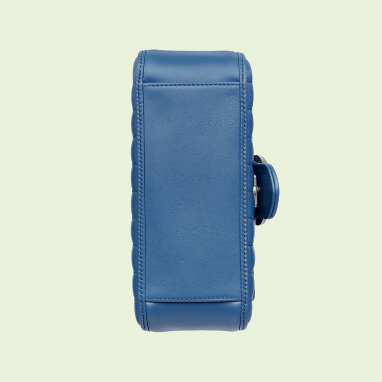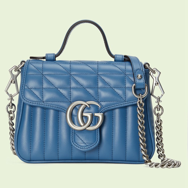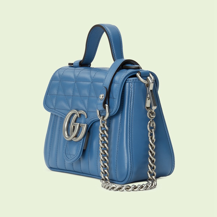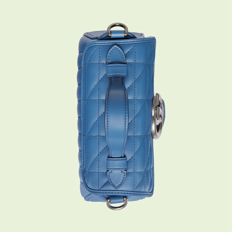 Style 583571 UM8AF 4340 The GG Marmont is reimagined through eye-catching New shades and textures. A recognizable member of The Beloved lines, The line is defined by its Double G hardware and matelassé leather. As a Part of Gucci Love Parade, a New iteration of The line is introduced in blue With two different quilted geometric motifs. The mini top handle bag is completed by silver-toned Double G hardware.