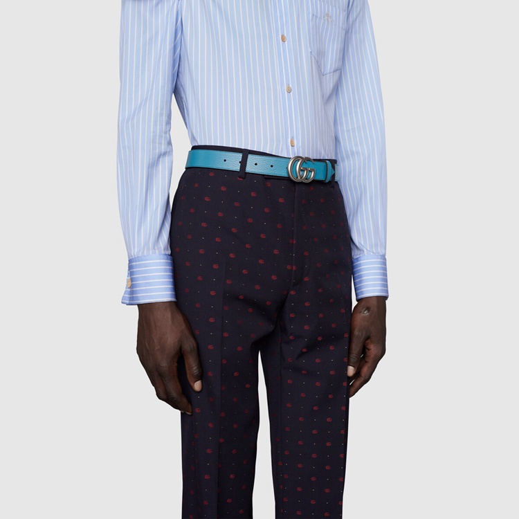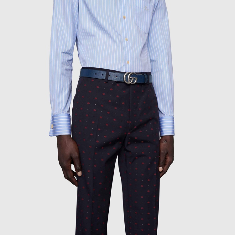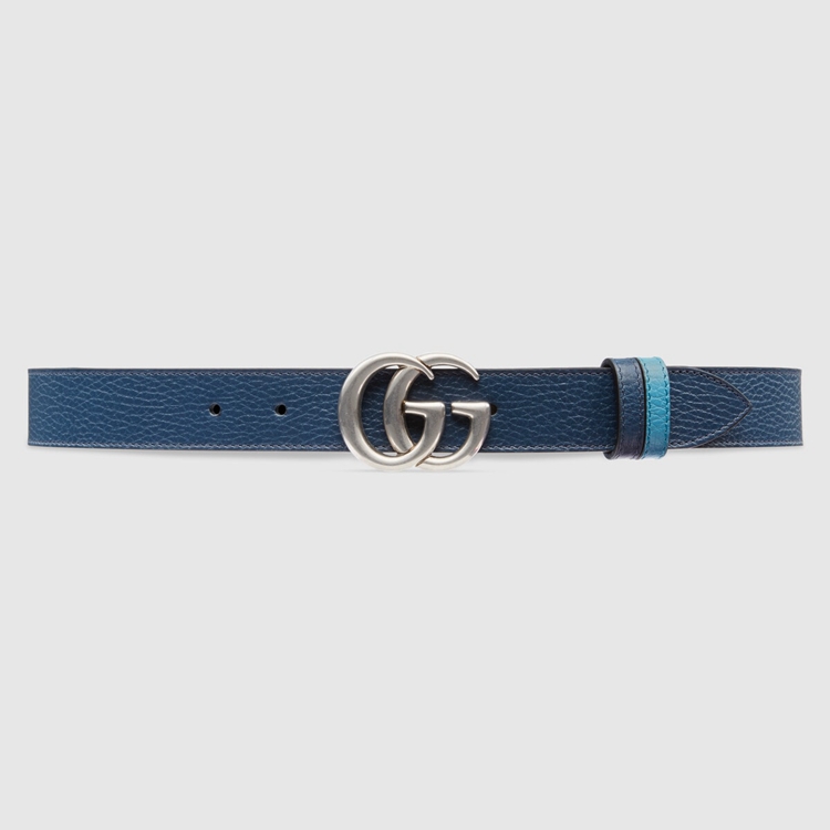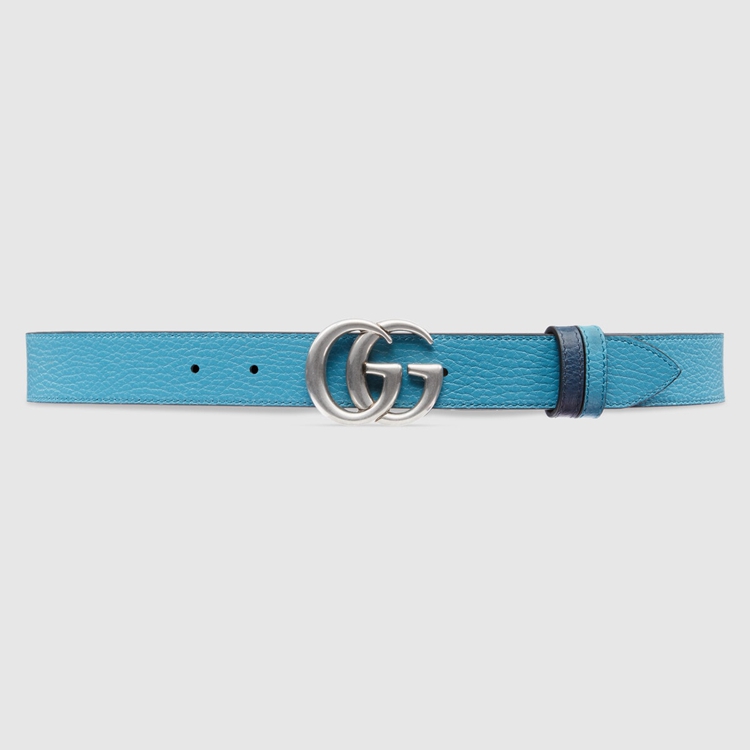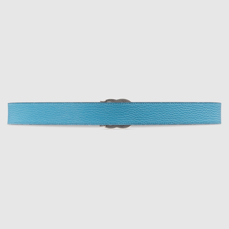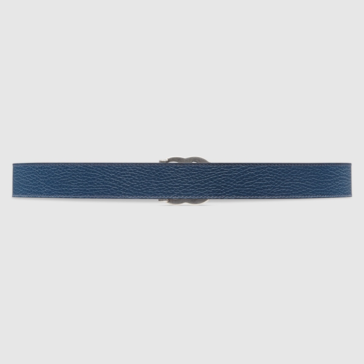 Style 643847 CAO2N 4492 This reversible belt speaks to The idea of transcending seasons. Presented in two contrasting shades of blue, The style adds a versatile note to a Classic accessory. The line’s signature Double G buckle completes The style.