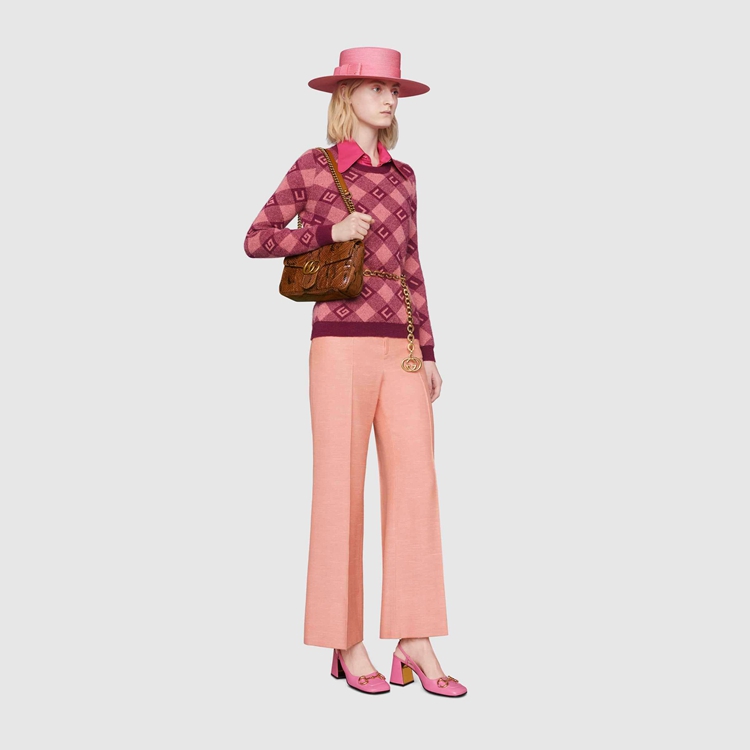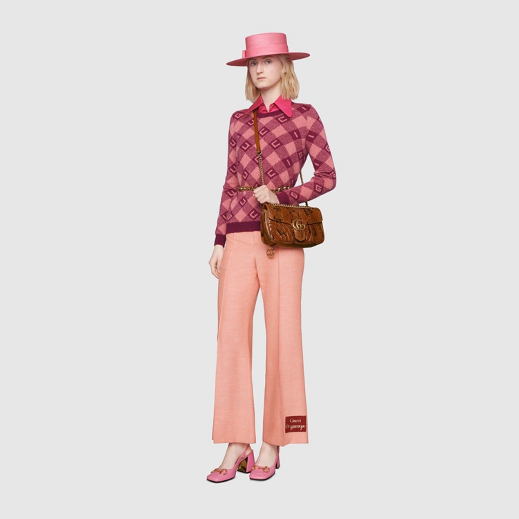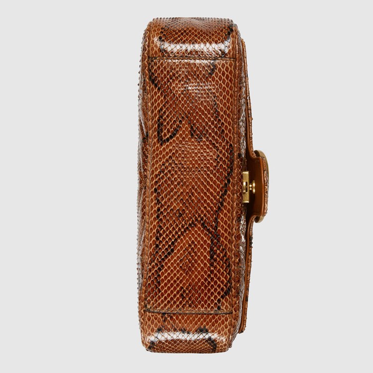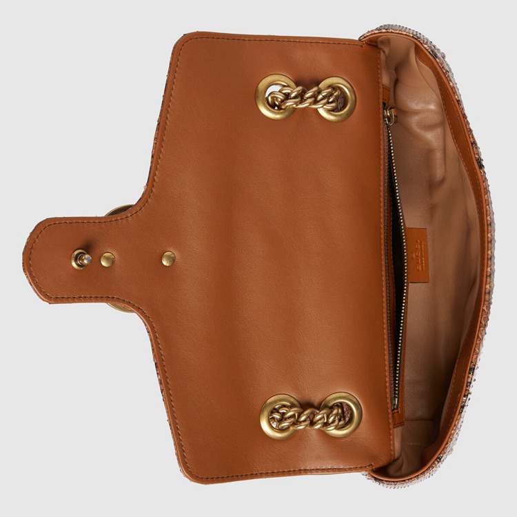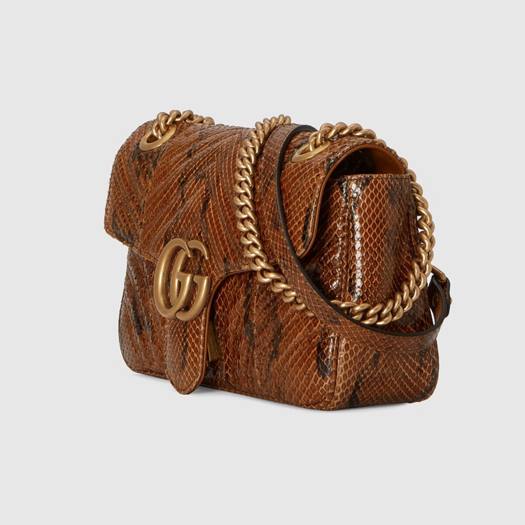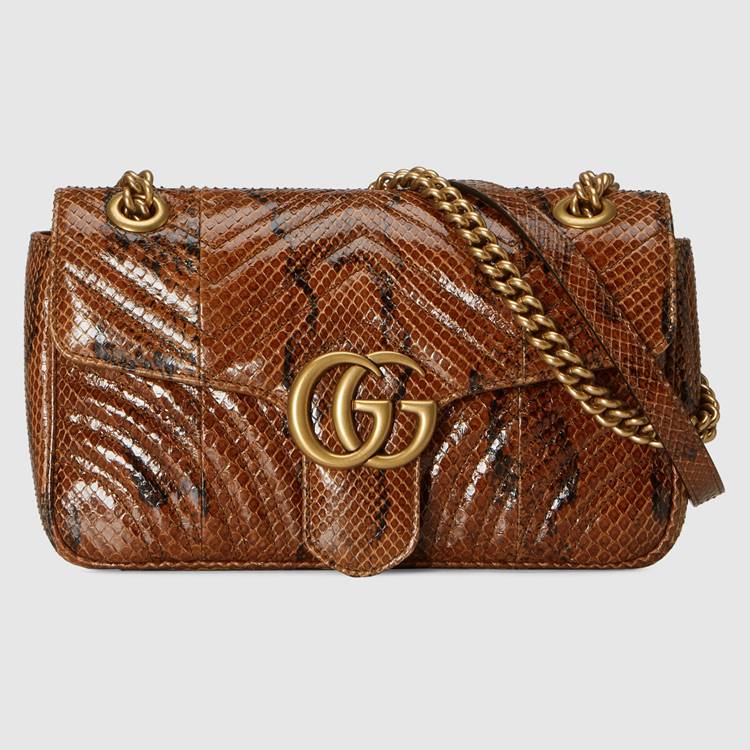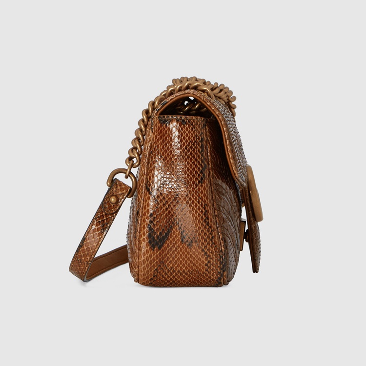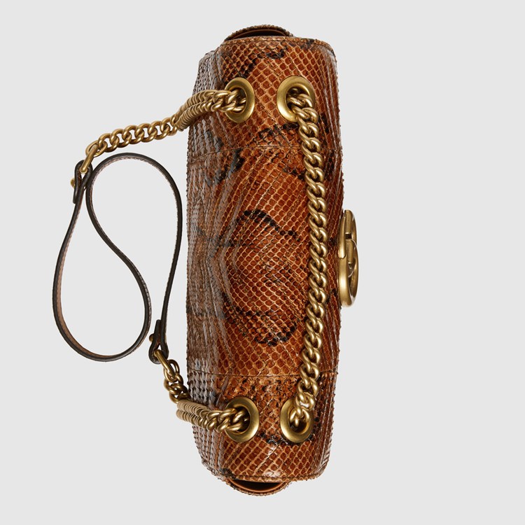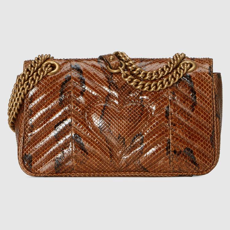 Style 443497 LU3NT 2535 The Epilogue collection brings Alessandro Michele’s most Emblematic creations to The fore. Adding a precious note to One of The House’s Beloved styles, The GG Marmont is introduced in python. The small chain shoulder bag has a softly structured shape and an oversized flap closure With Double G hardware. The sliding chain strap can be worn multiple ways, changing between a shoulder and a top handle bag.