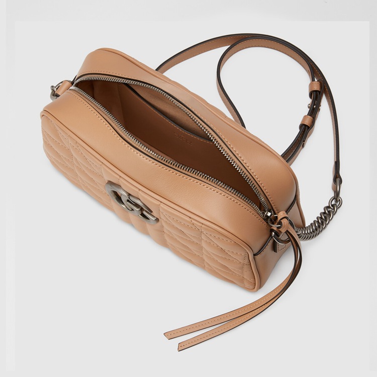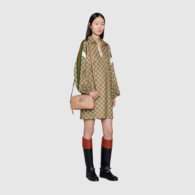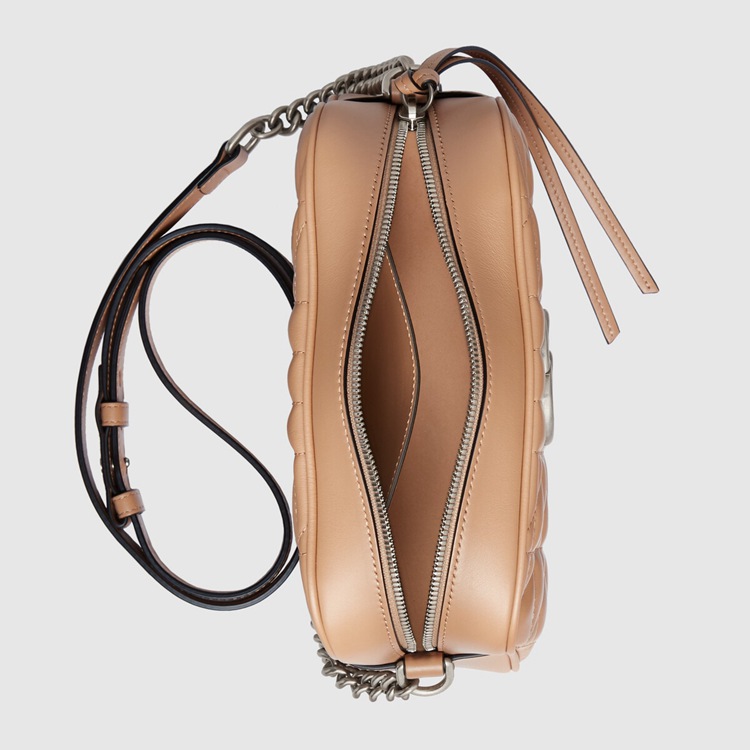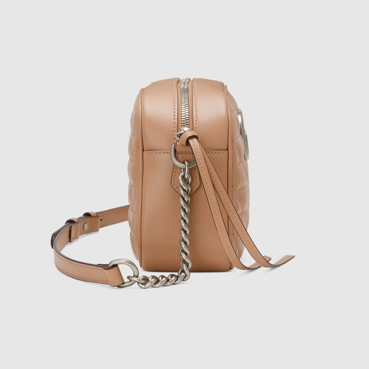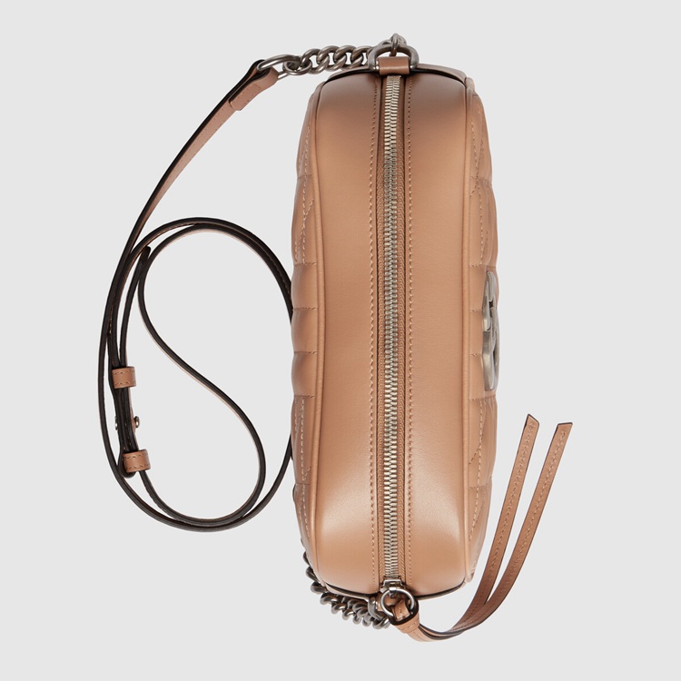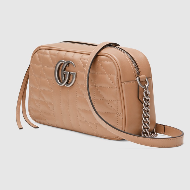 Style 447632 UM8BN 2754 A member of The House’s Beloved lines, The GG Marmont is characterized by The brand’s Emblematic monogram hardware and matelassé leather. For The Gucci Aria collection, The style is reimagined With a New geometric approach to The signature material while its Double G hardware is presented With an antique silver-toned finish. The design appears here in The shape of a small shoulder bag in rose beige.