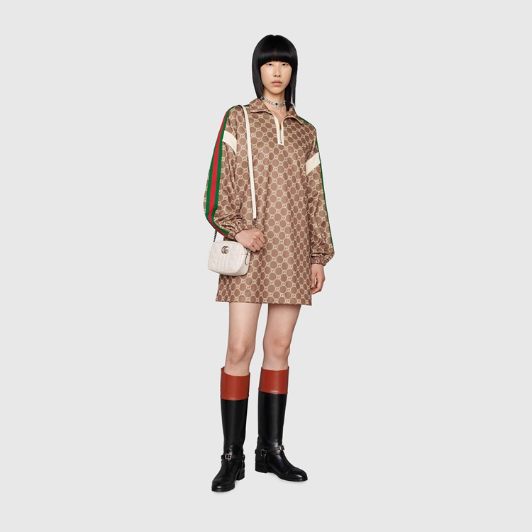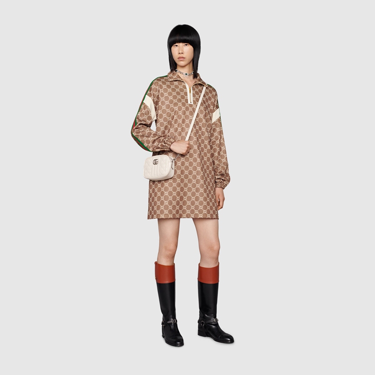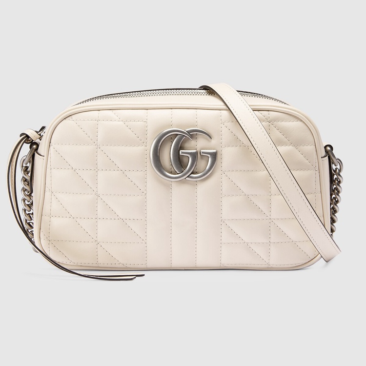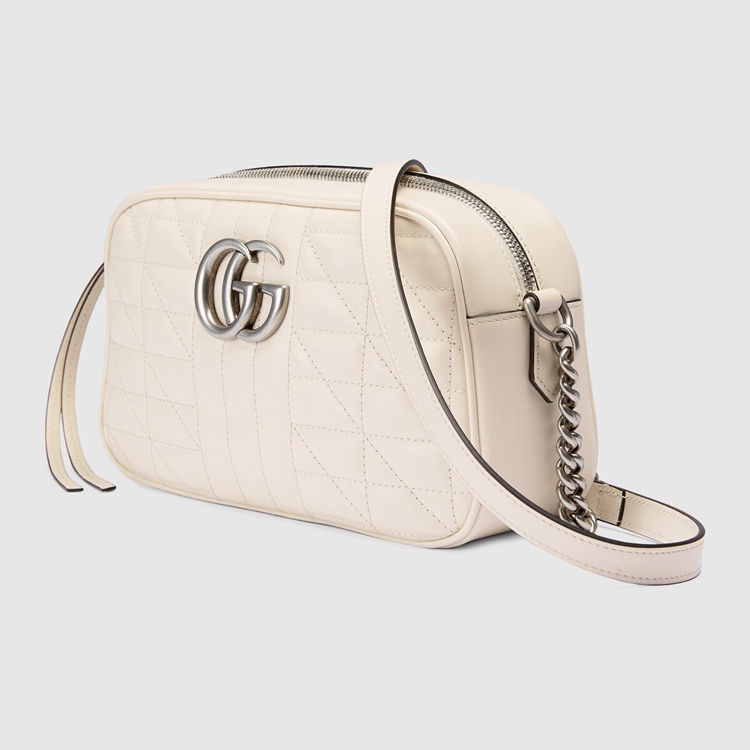 Style 447632 UM8BN 9022 A member of The House’s Beloved lines, The GG Marmont is characterized by The brand’s Emblematic monogram hardware and matelassé leather. For The Gucci Aria collection, The style is reimagined With a New geometric approach to The signature material while its Double G hardware is presented With an antique silver-toned finish. The design appears here in The shape of a small shoulder bag in white.