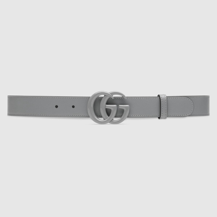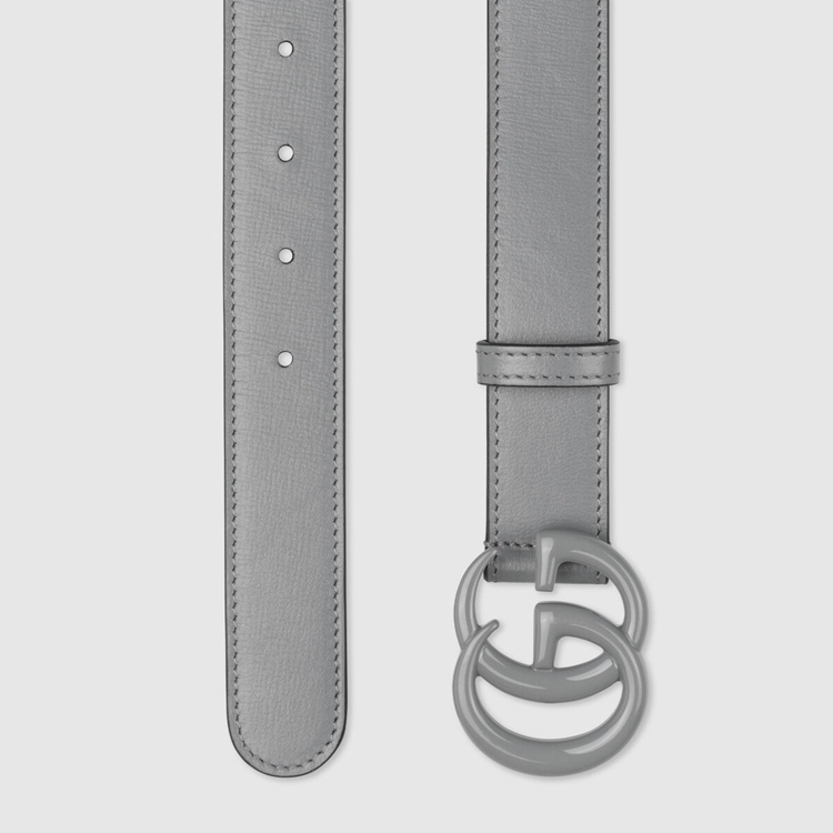 Style 414516 18YXV 1711Monochrome styles appear throughout The Aria collection, adding a minimalist feel to Classic accessories. Here, The GG Marmont belt is presented in grey leather With a tonal Double G buckle.