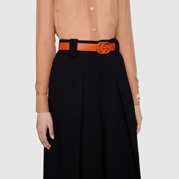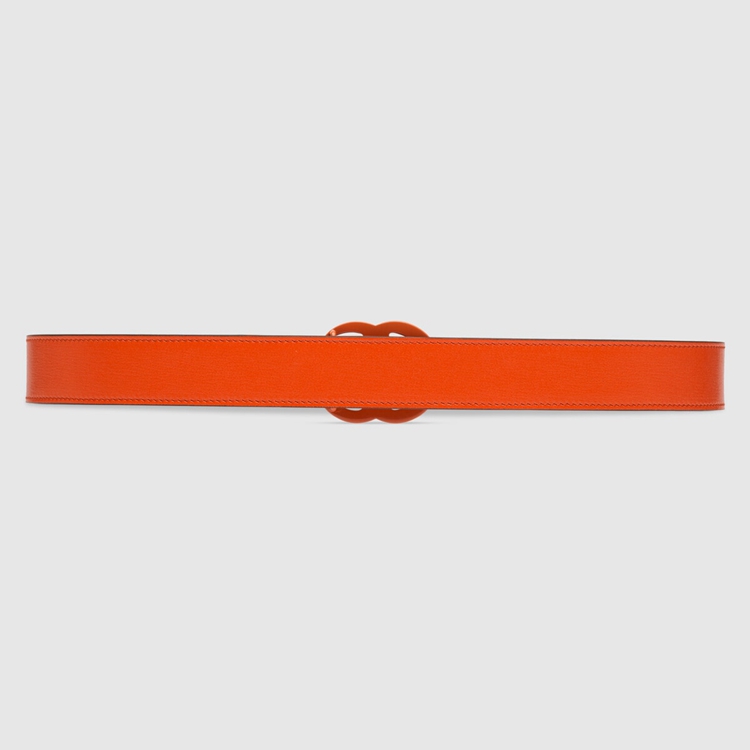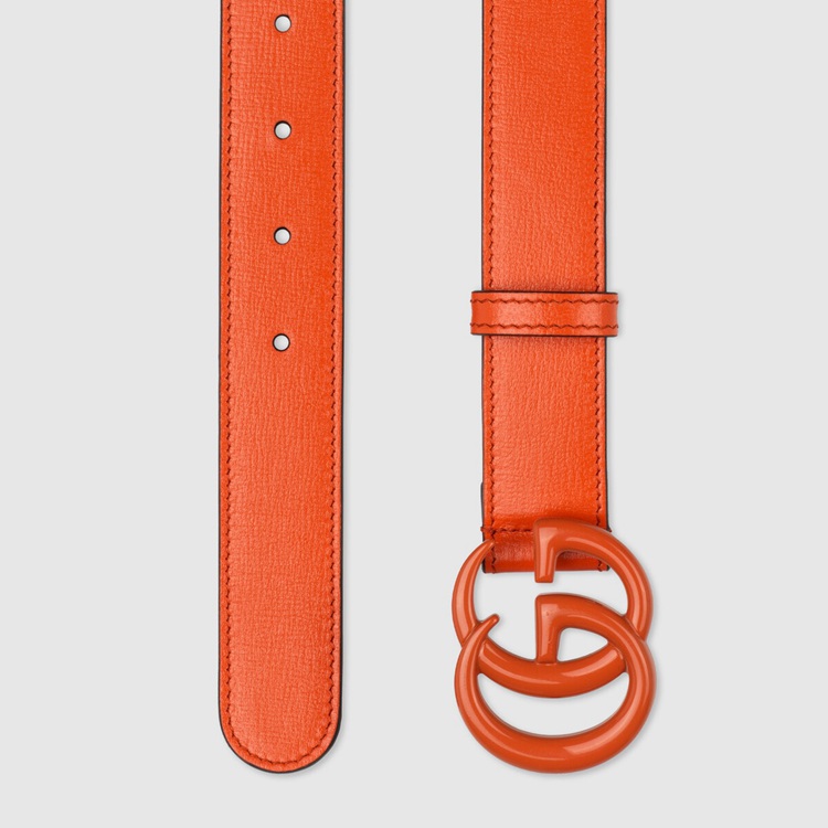 Style 414516 18YXV 7519 The GG Marmont belt is reimagined With a streamlined monochrome design in a bright shade of orange. The line’s monogram hardware is presented in resin, giving The archival symbol a contemporary note.
