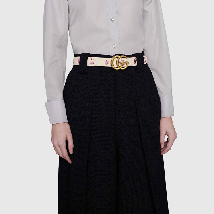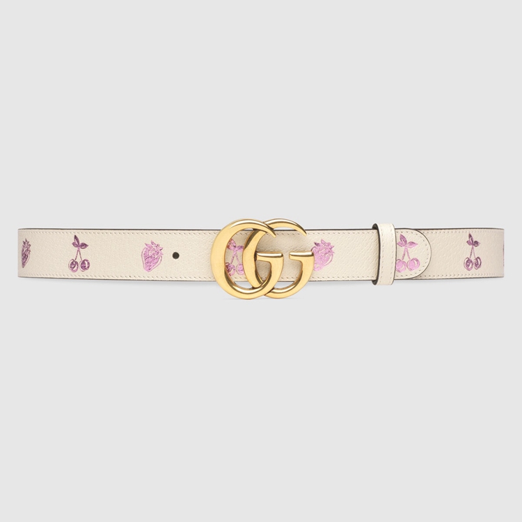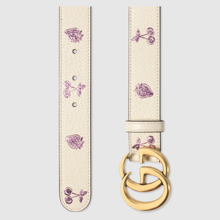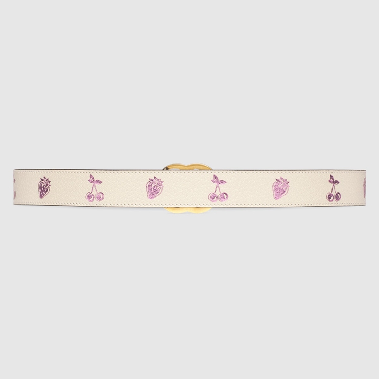 Style 625839 1T5ZV 9181An emblem of The Gucci’s playful spirit, fruits and vegetables have become contemporary House codes that animate The Creative Director’s latest collections. A New take on The theme, This thin belt is characterized by a whimsical strawberry and cherry print With a metallic finish. The accessory is presented in white leather and completed by The GG Marmont’s Emblematic Double G buckle.