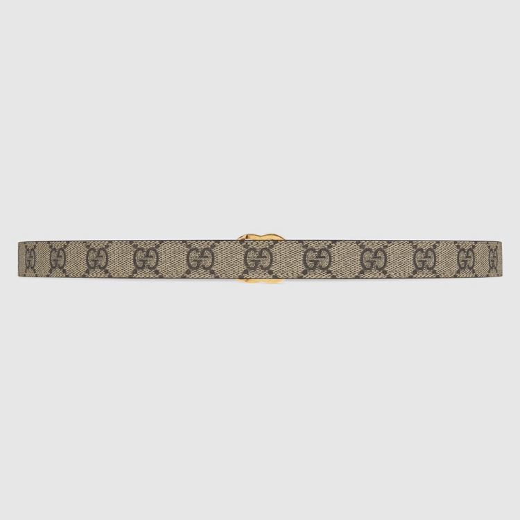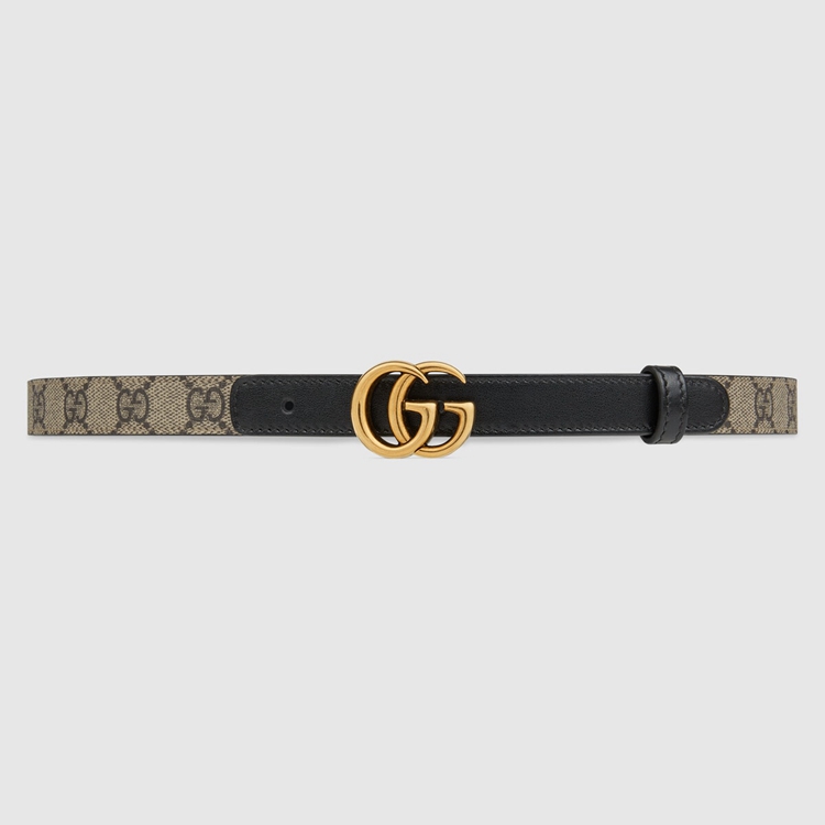 Style 409417 92TLC 9769 The Double G buckle brings The present into The House’s past, The notion of a cherished wardrobe is reinforced With items that can be worn season after season. This thin GG Marmont belt is Crafted in GG Supreme canvas and is trimmed in black leather.