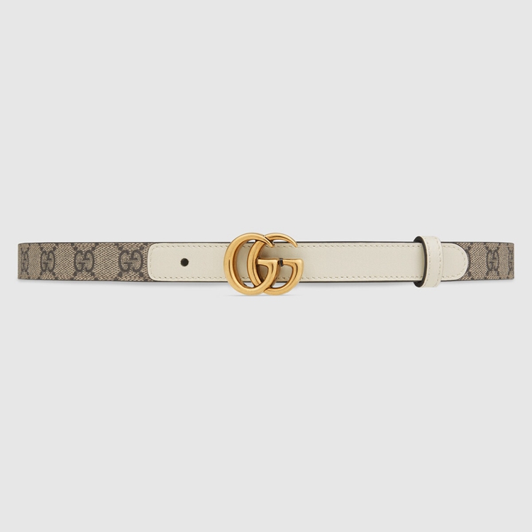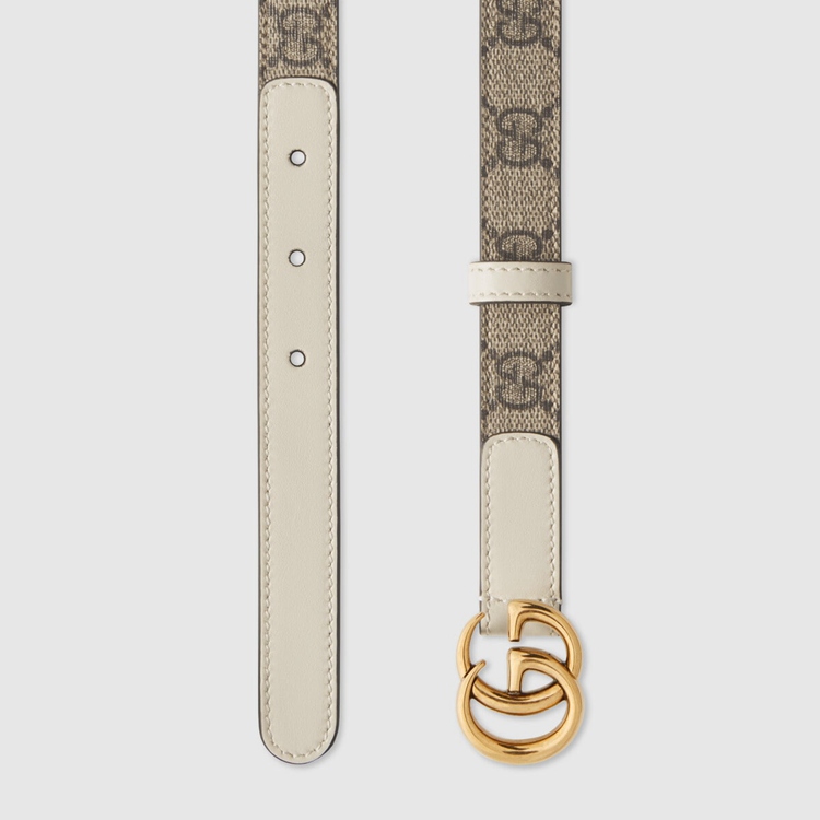 Style 409417 92TLC 9761 The Double G buckle brings The present into The House’s past, The notion of a cherished wardrobe is reinforced With items that can be worn season after season. This thin GG Marmont belt is Crafted in GG Supreme canvas and is trimmed in white leather.