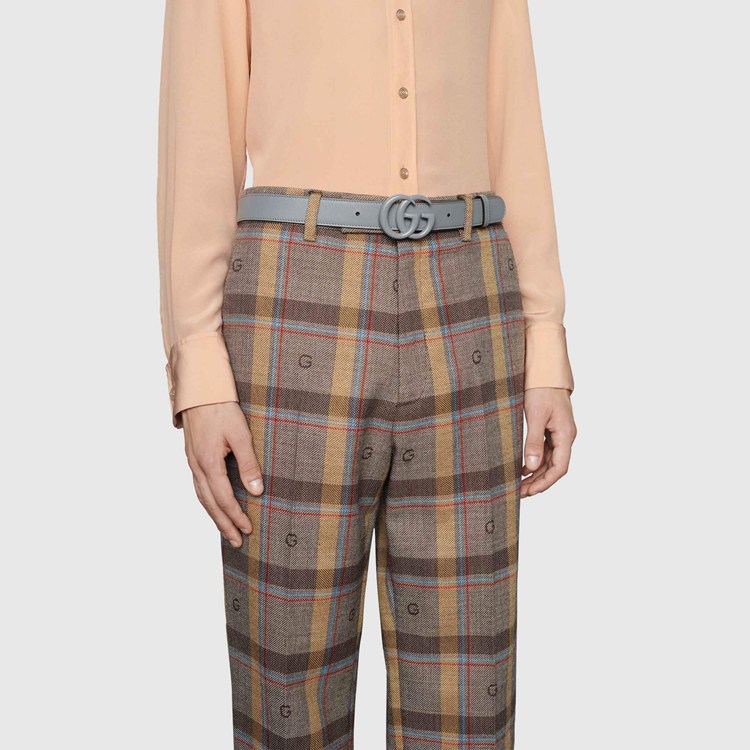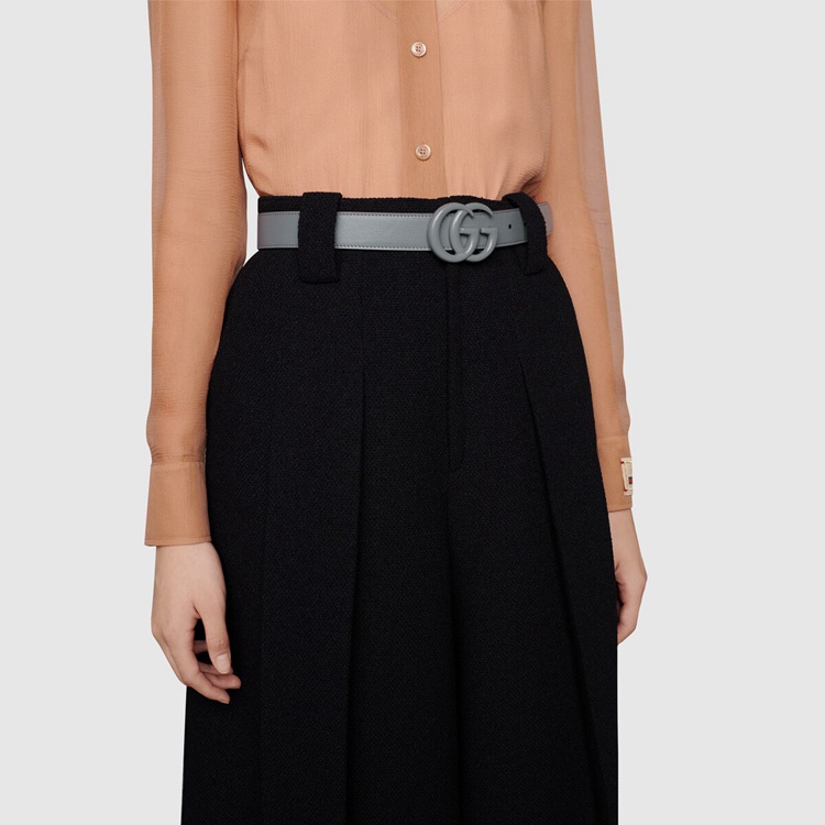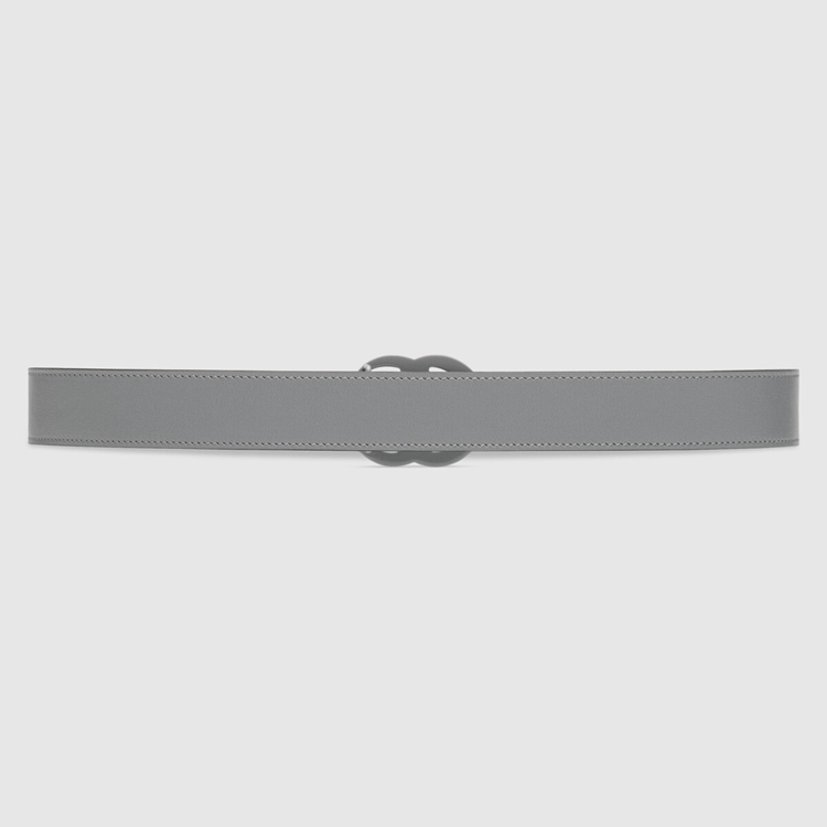 Style 414516 18YXV 1711Monochrome styles appear throughout The Aria collection, adding a minimalist feel to Classic accessories. Here, The GG Marmont belt is presented in grey leather With a tonal Double G buckle.