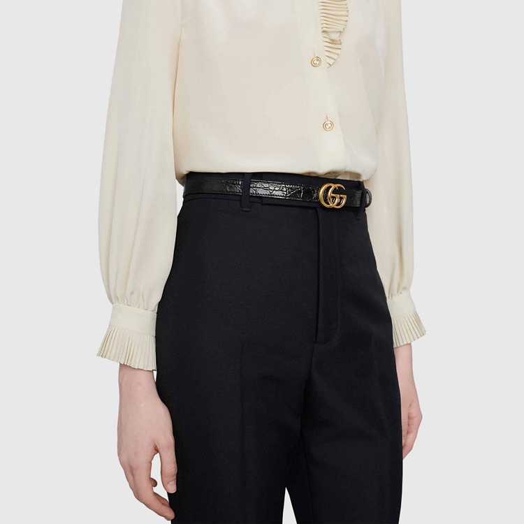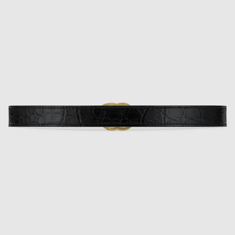 Style 409417 E7I0O 1000 The Emblematic Double G is reintroduced For Spring Summer 2020 in a luminous gold-tone, set on a women’s thin black caiman belt.