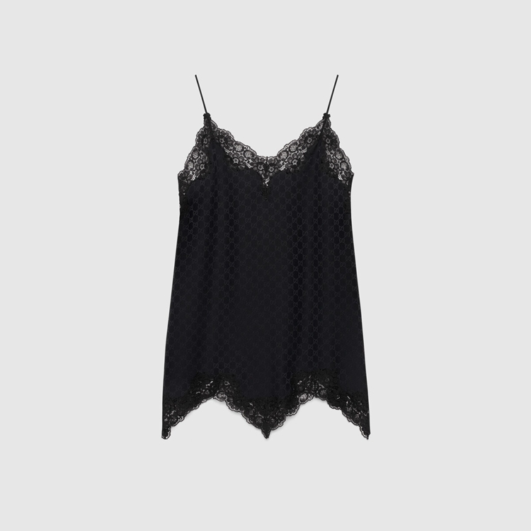 Style 613605 XUABM 1000 Ready-to-wear Designs With lingerie Inspired details define The Spring Summer 2020 collection. Crafted from black GG silk crêpe, This short dress With tonal lace trims speaks to The idea of freedom that fashion experienced in The ‘90s, a theme that Inspired This season’s looks.