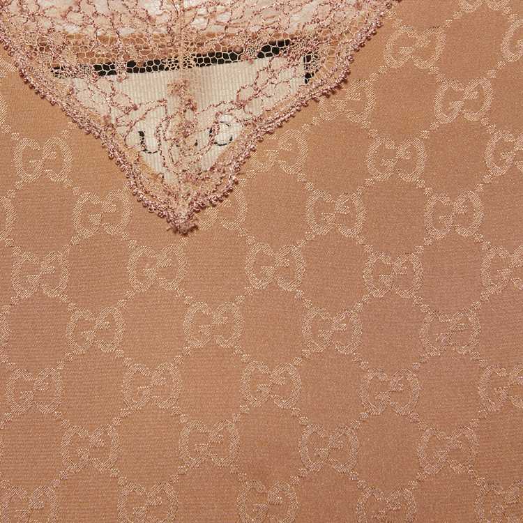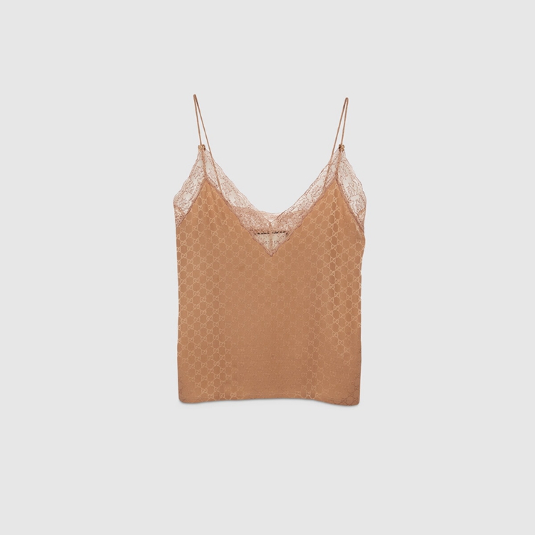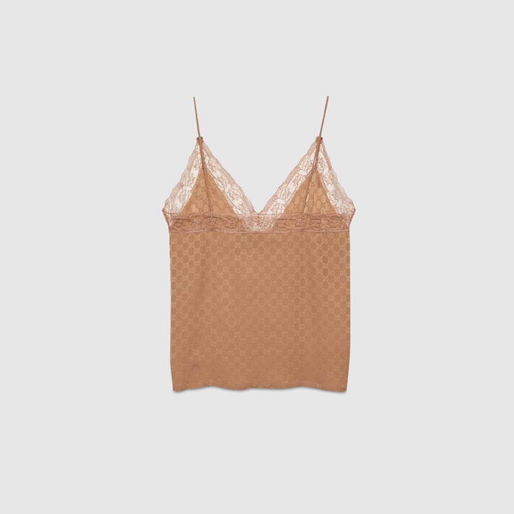 Style 629249 XJCUD 2045 Ready-to-wear Designs With lingerie Inspired details define The latest Gucci collections. Crafted from camel GG silk crêpe, This lace-trimmed top speaks to The idea of freedom that fashion experienced in The ‘90s.