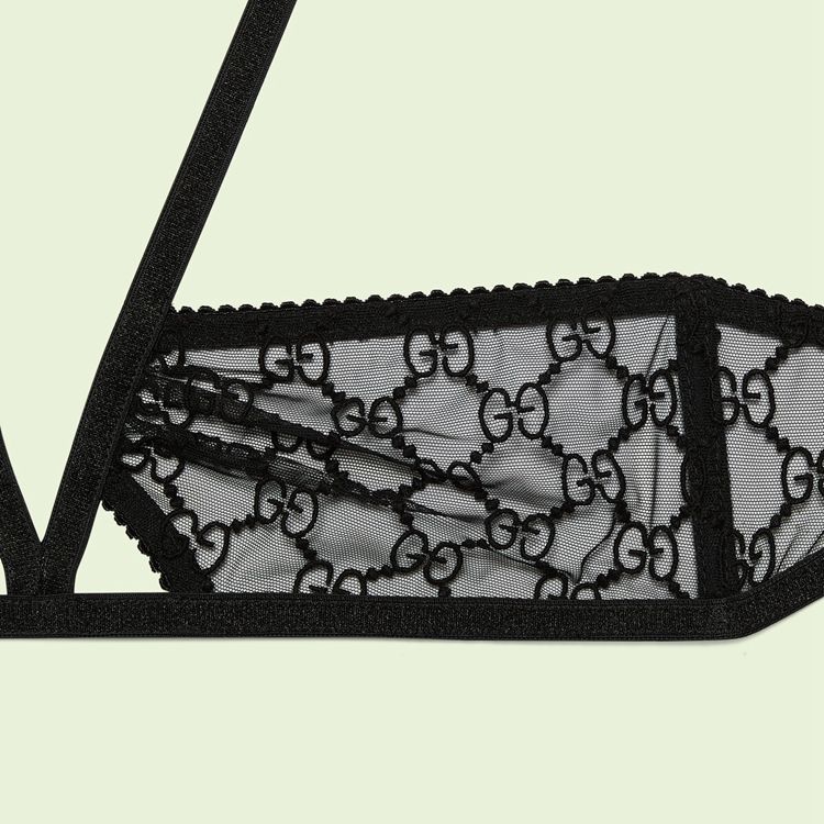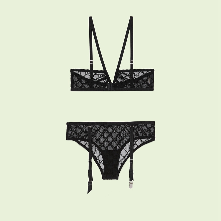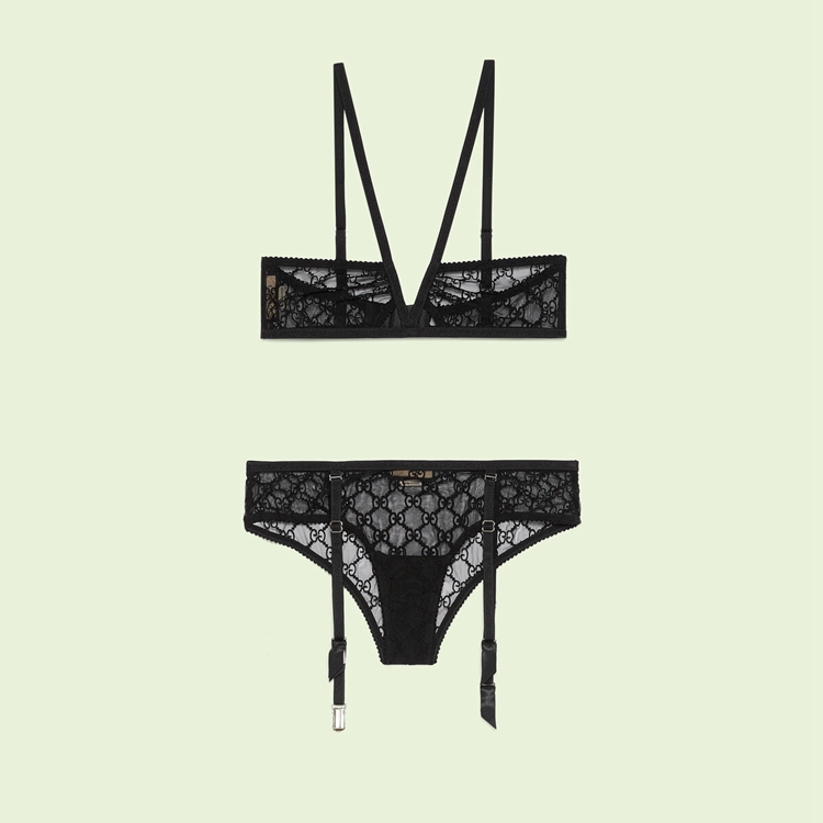 Style 703913 XUAEY 1000 The sensual mood introduced by Gucci Aria continues With The Gucci Love Parade chapter. Crafted from black GG star tulle, This lingerie set embodies what The Creative Director describe as a “beautiful cliché of sexiness,” a concept With hints to The idea of freedom that fashion experienced in The ’90s.