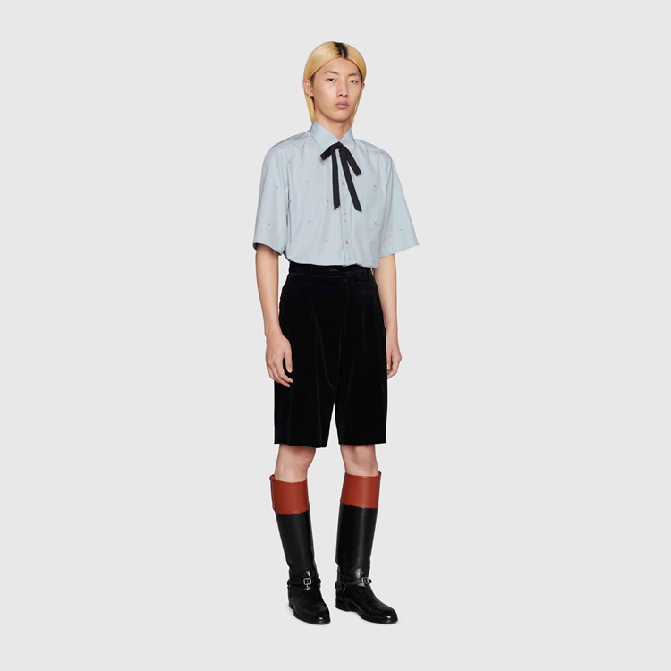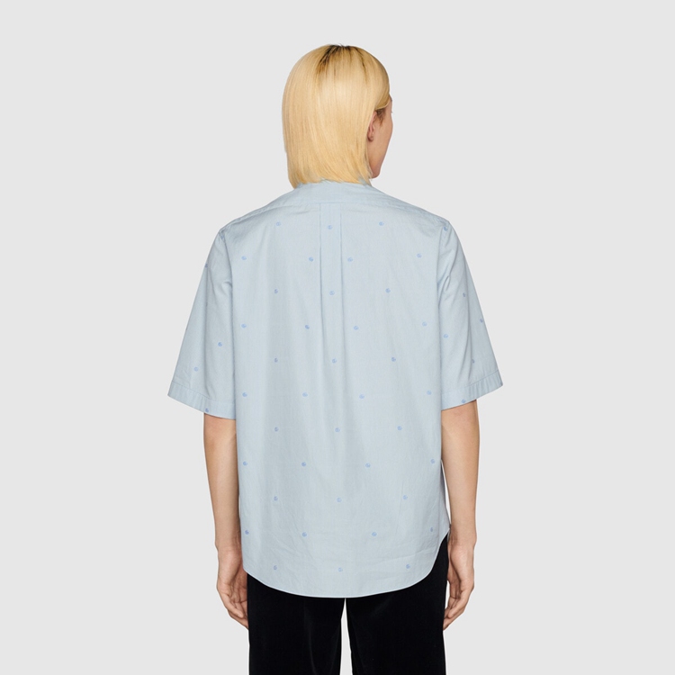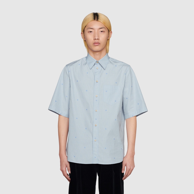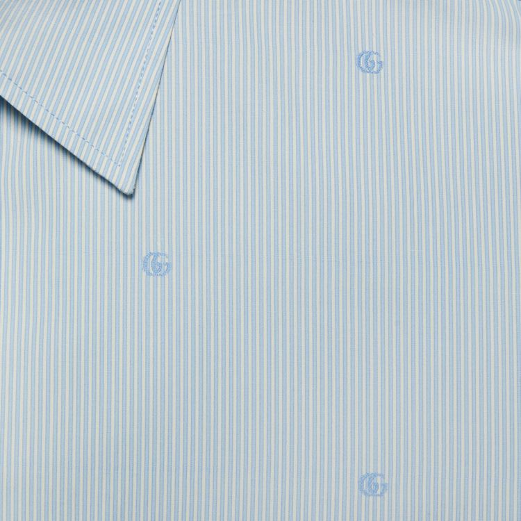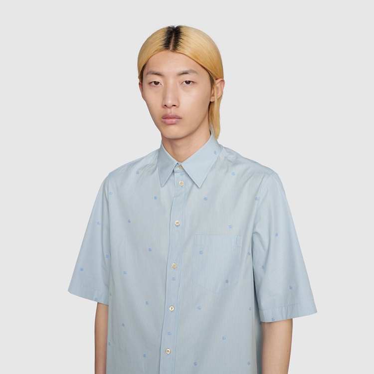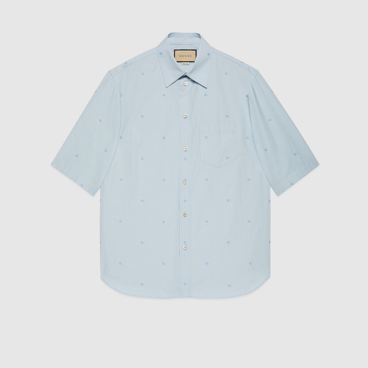 Style 673493 ZAHIR 4043Shapes that reflect styles from The ‘70s are mixed and layered With silhouettes rooted in The now. Designed With a vintage Inspired point collar and enriched by GG stripe design, This blue and white cotton shirt has a rounded bottom hem.