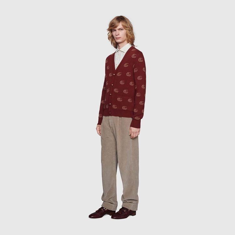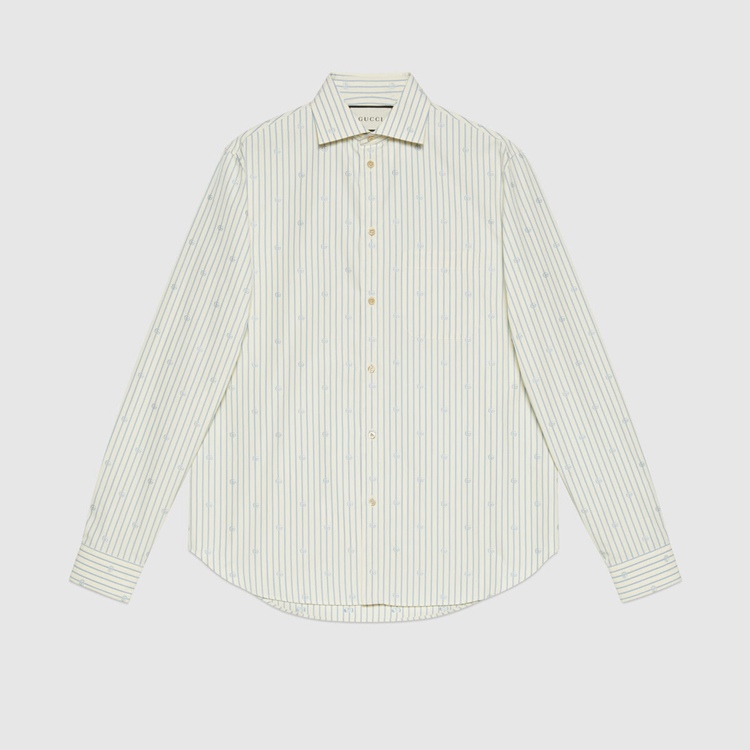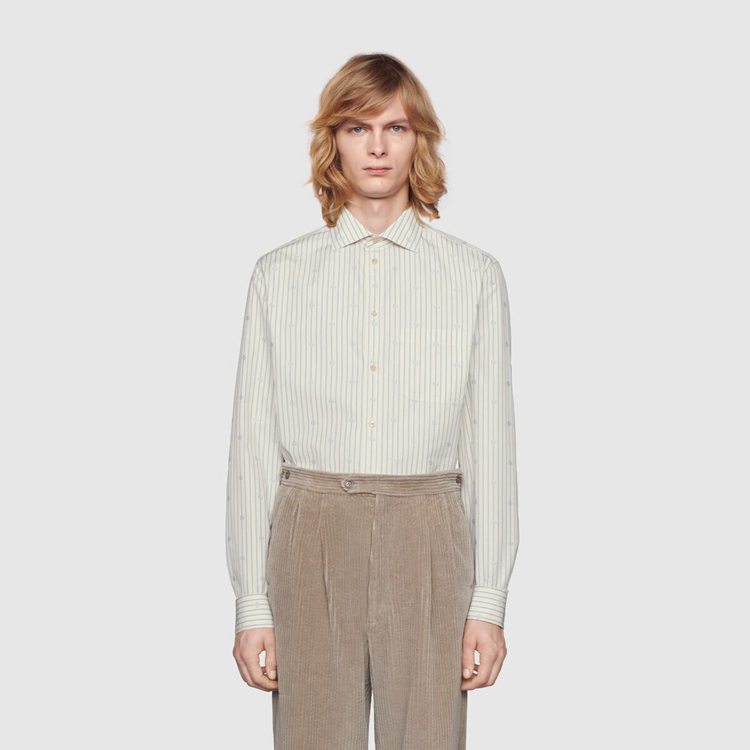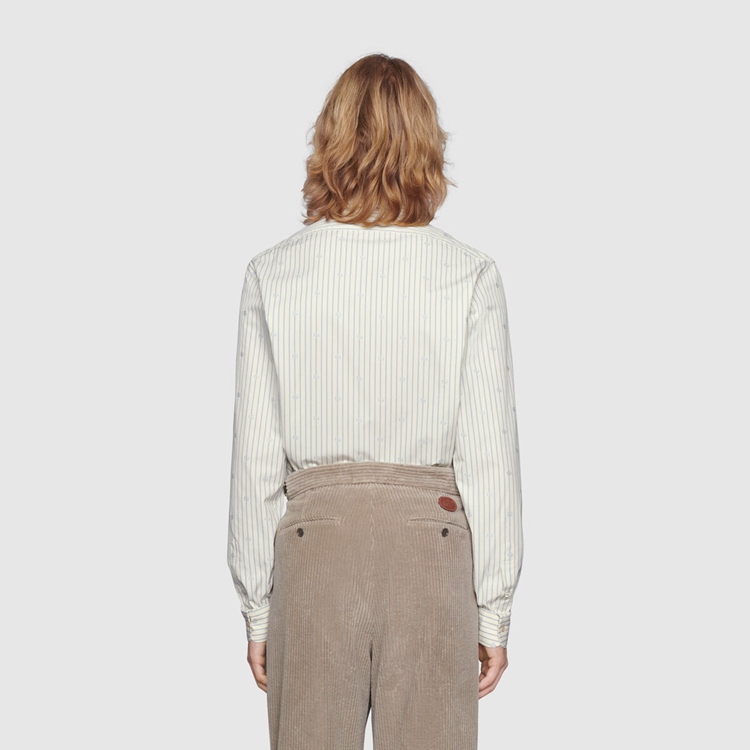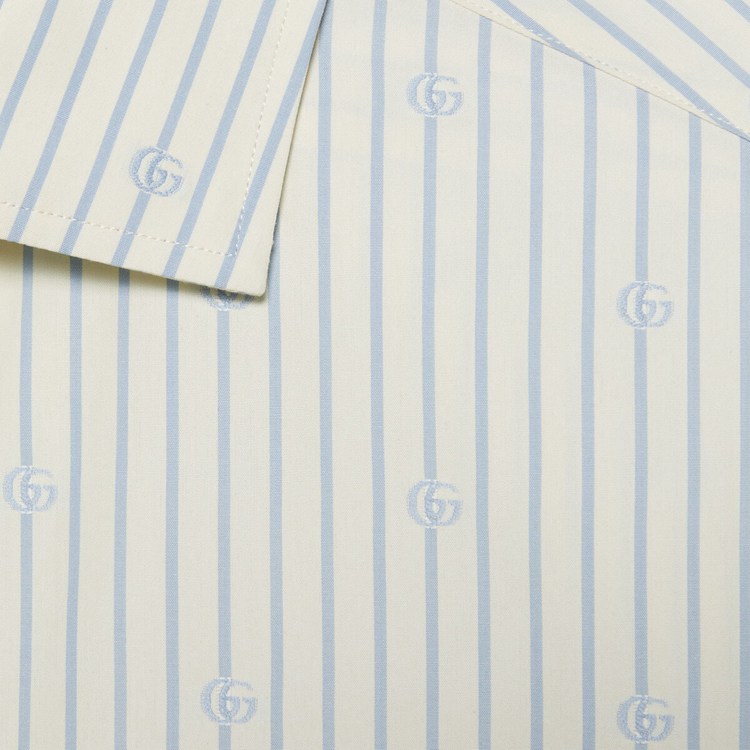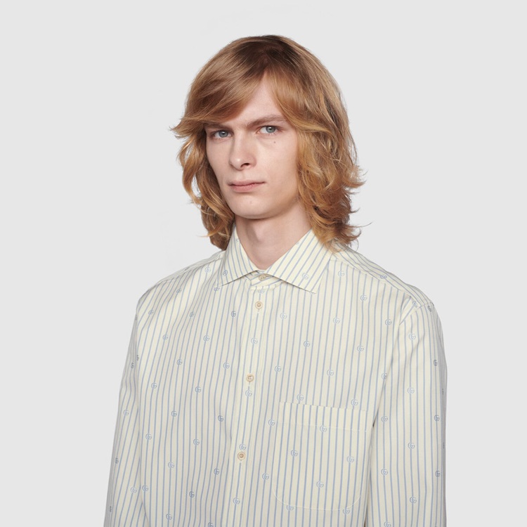 Style 644984 ZAFXS 9018 A recurrent pattern of The Gucci collections, The light blue GG stripe fil coupé motif enriches This off-white cotton shirt, designed With a point collar and boxy fit.