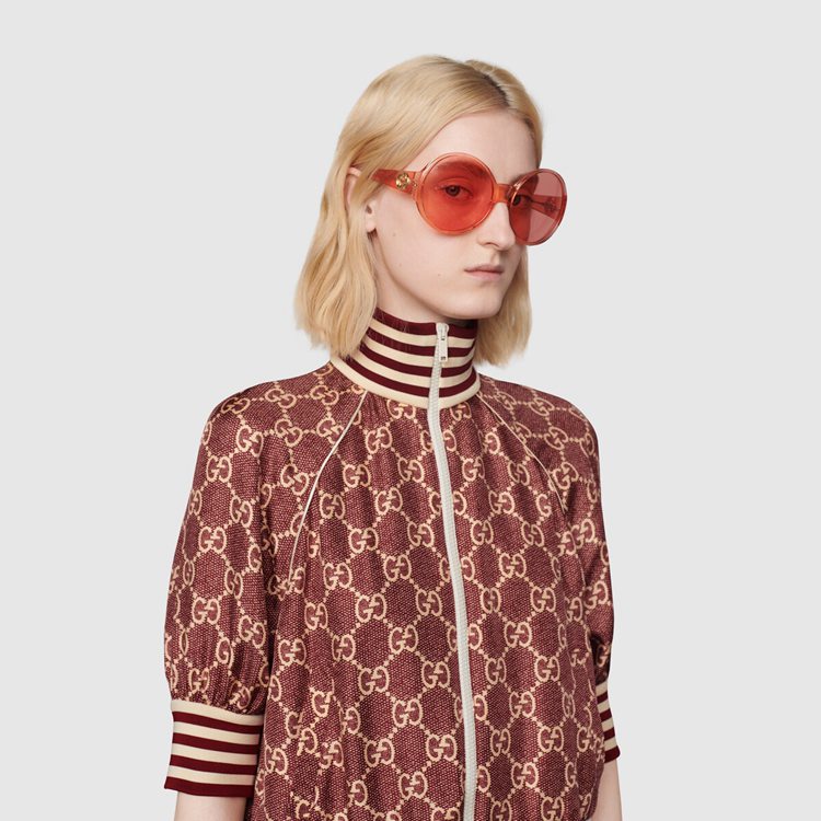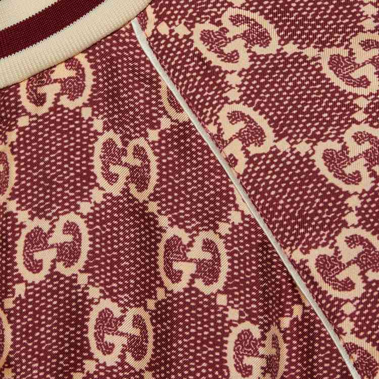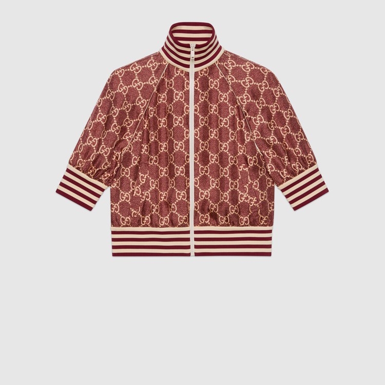 Style 644588 XJCL5 5281 The GG Supreme pattern gets reinterpreted into ready-to-wear silhouettes Crafted from refined fabrics, For an unexpected take on activewear. Here, The Emblematic motif animates a silk twill jacket enhanced by colorful lamé stripes down The sides. The elastic trim adds a sporty feel.