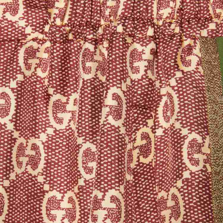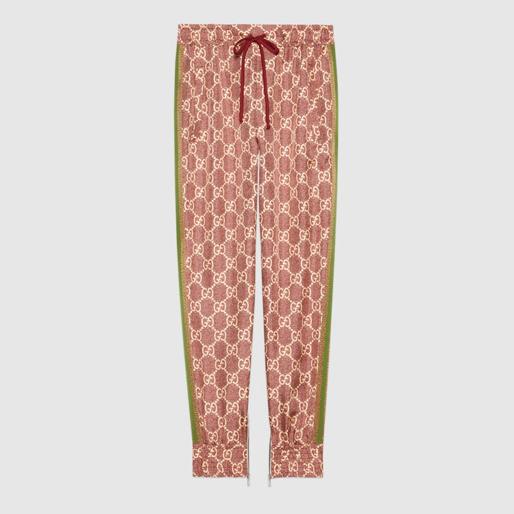 Style 625005 XJCL5 5281 The GG Supreme pattern gets reinterpreted into ready-to-wear silhouettes Crafted from refined fabrics, For an unexpected take on activewear. Here, The Emblematic motif animates a silk twill pant enhanced by colorful lamé stripes down The sides. The elastic waistband adds a sporty feel.