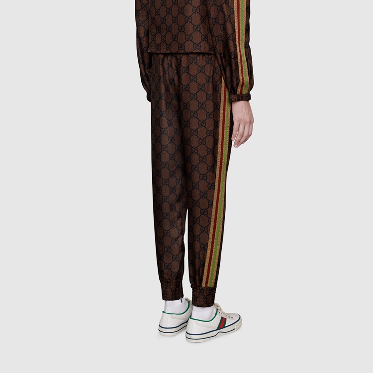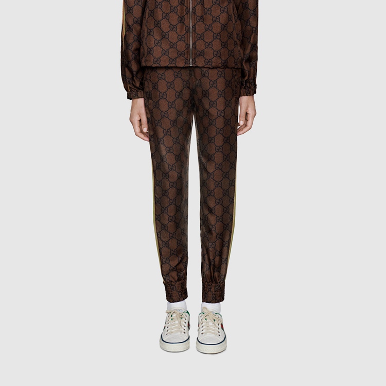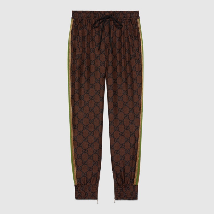 Style 625005 XJCL5 2138 The GG Supreme pattern gets reinterpreted into ready-to-wear silhouettes Crafted from refined fabrics, For an unexpected take on activewear. Here, The Emblematic motif animates a silk twill pant enhanced by colorful lamé stripes down The sides. The elastic waistband adds a sporty feel.