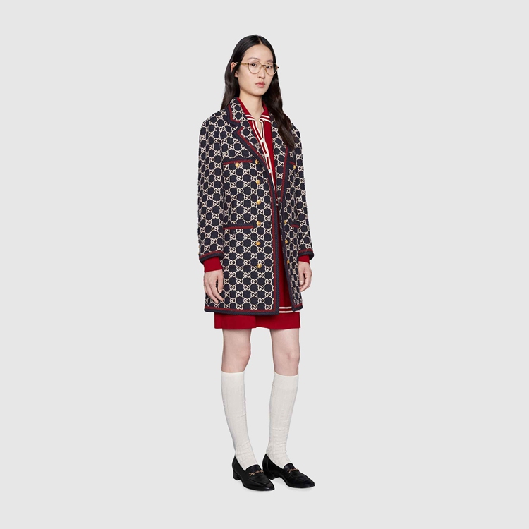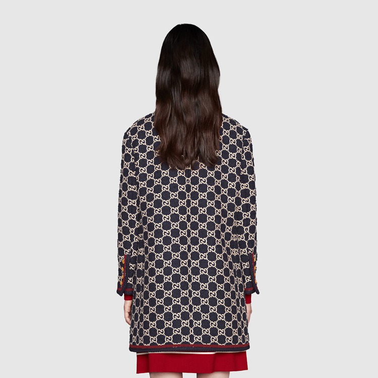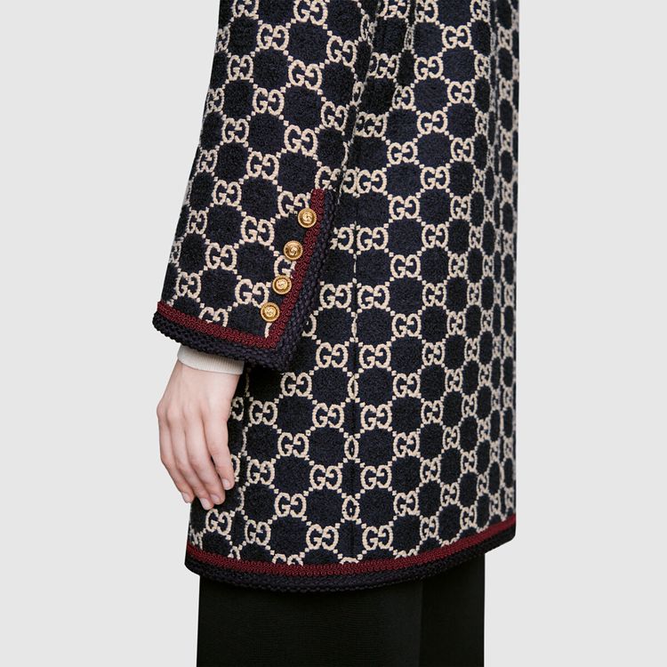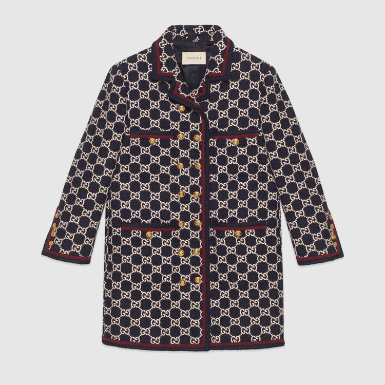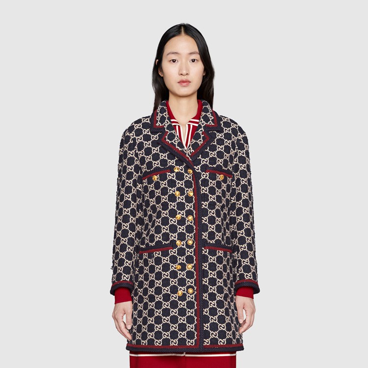 Style 577448 ZAAMP 4447An oversize coat in blue and ivory GG tweed—a distinctive fabric With a textured finish highlighting The iconic GG, first used in The 1970s its an evolution of The original Gucci rhombi design from The 1930s. Imbued With an inherent ladylike feel, tweed continues to define a wide range of Gucci styles, from traditional silhouettes through unexpected, contemporary shapes.