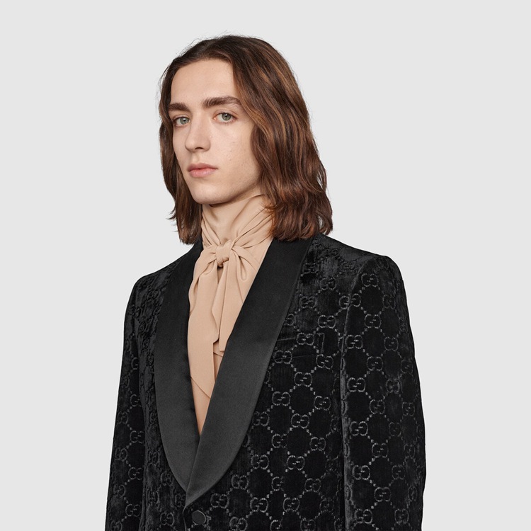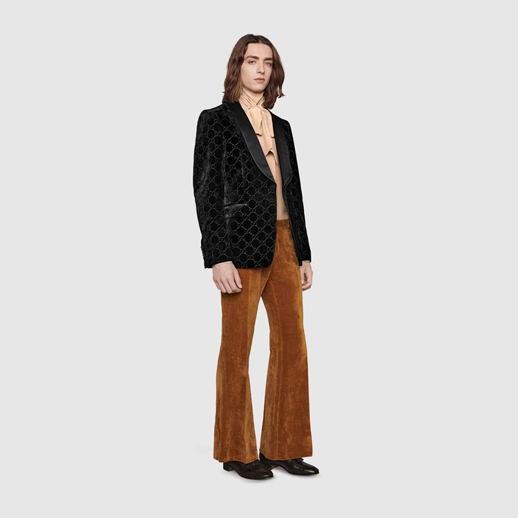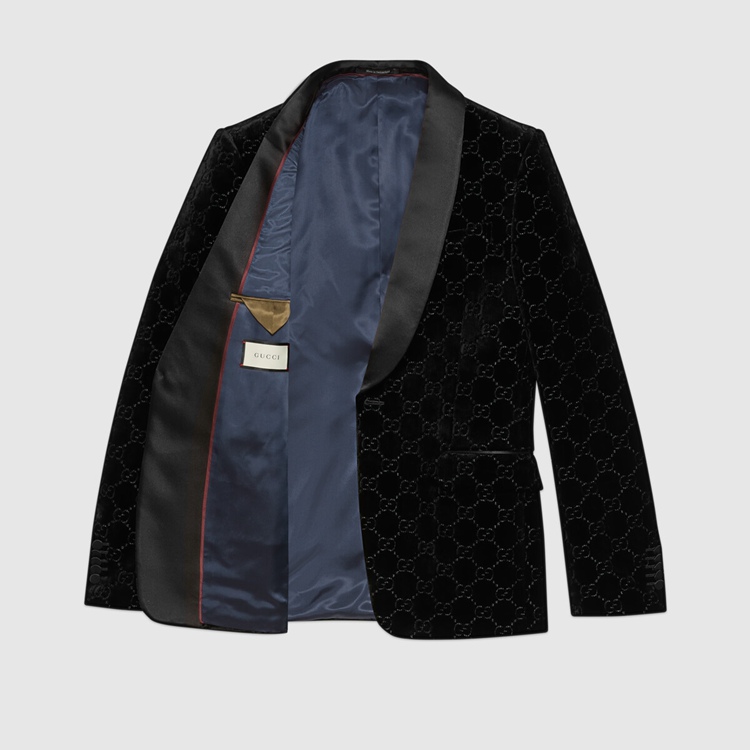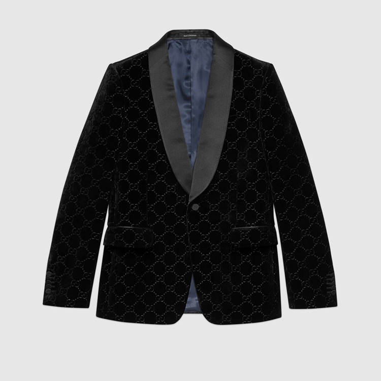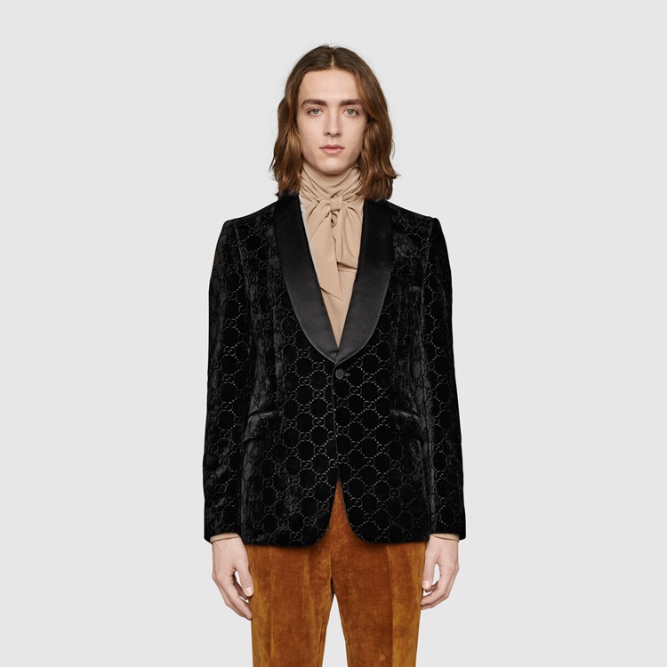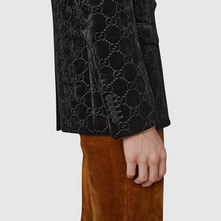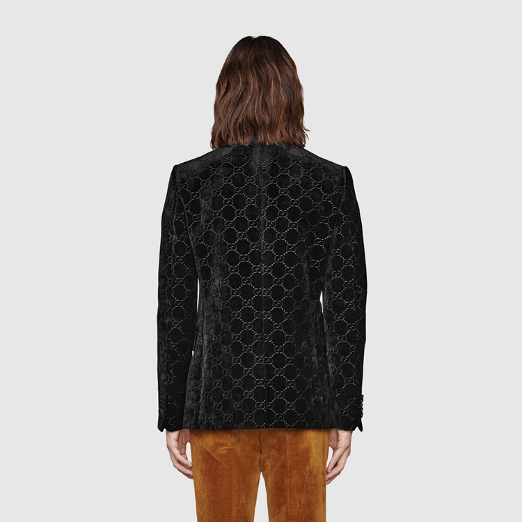 Style 639030 Z402L 1000Presented on This single-breasted jacket With shawl lapel, GG velvet is an archival material With The GG logo embedded into soft velvet. The use of The fabric pays homage to Gucci’s heritage while reinforcing The notion that Emblematic codes transcend seasons.