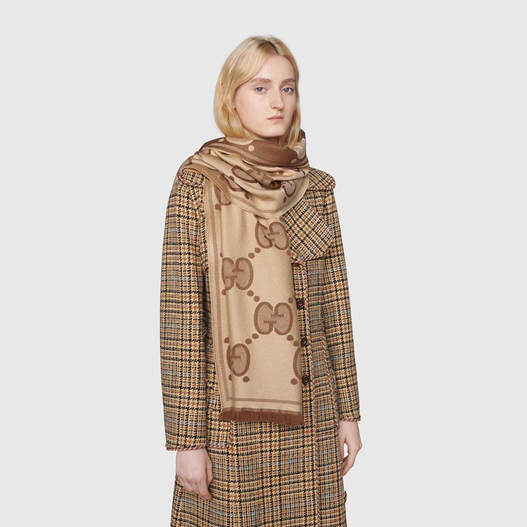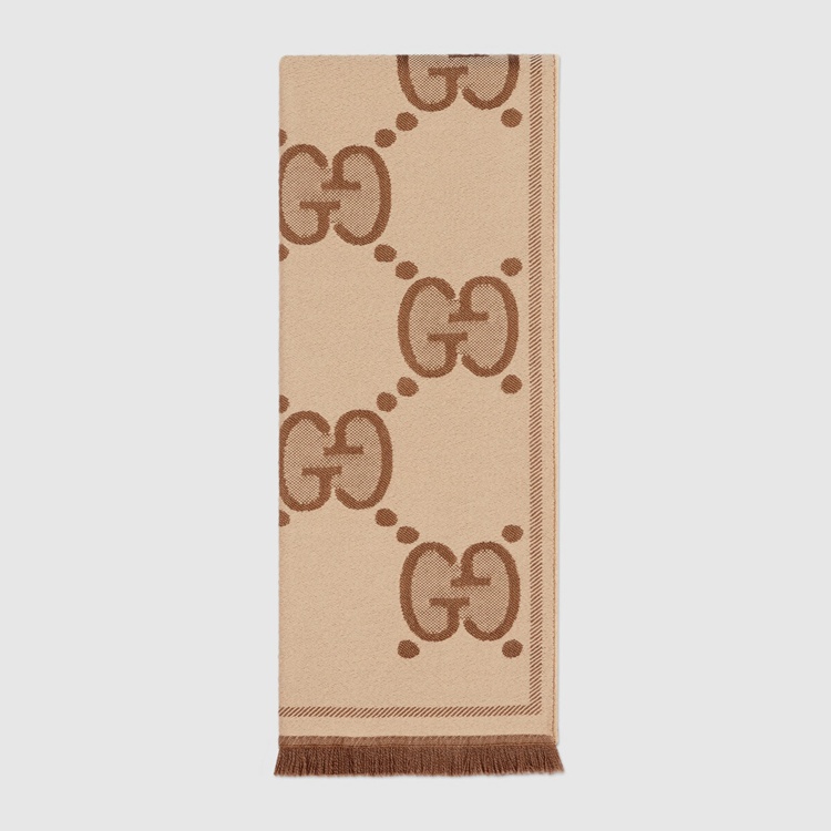 Style 581537 3G200 9764 Crafted in organic wool in contrasting shades of beige and brown, This jacquard scarf is defined by The House’s recognizable GG motif. Inspired by The original Gucci rhombi pattern, The design was first introduced in The ’70s and continues to animate The latest collections.