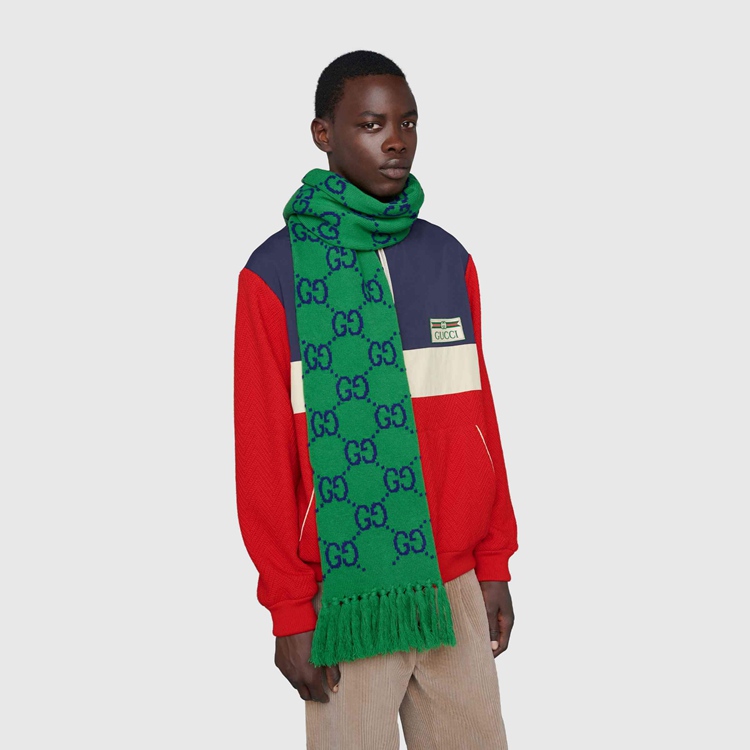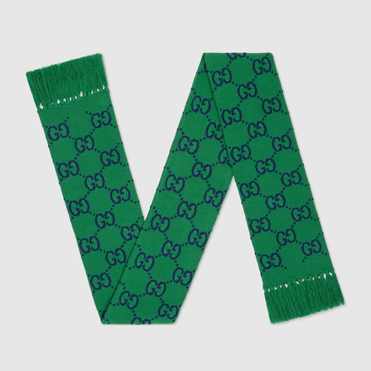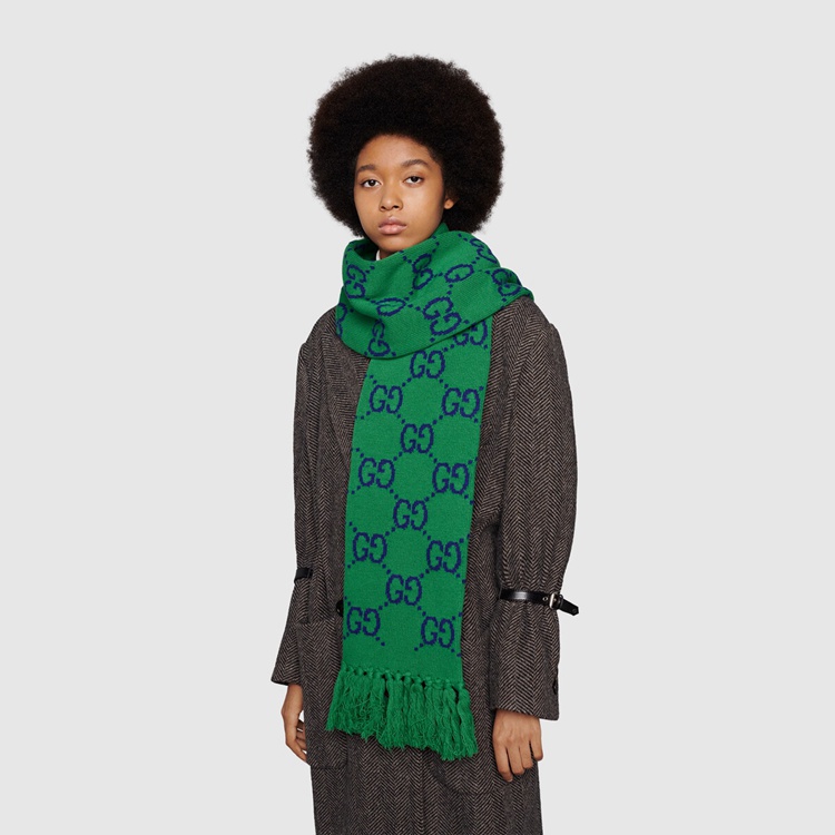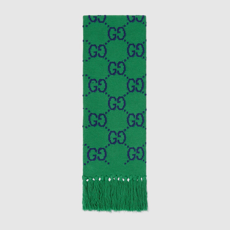 Style 676191 4G206 3168Timeless pieces continue to elevate The House’s most Emblematic symbols in unexpected ways. Here, The GG motif appears as a vibrant blue jacquard across This green wool scarf, completed by fringe ends.