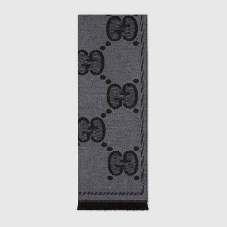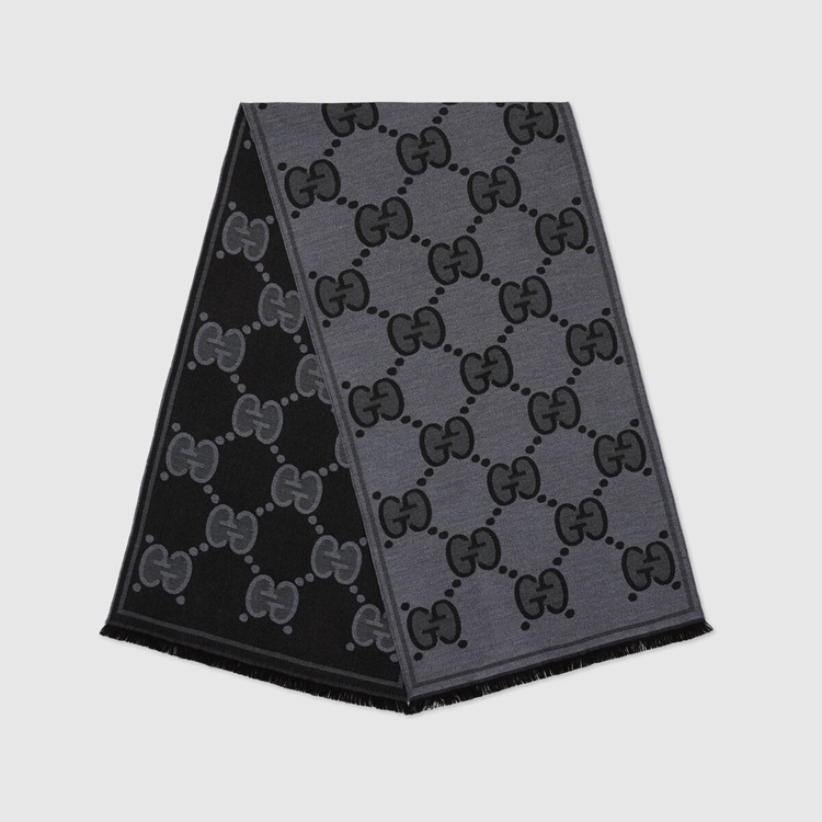 Style 598189 4G200 1460 This wool scarf is defined by The House’s monogram motif. Presented here in contrasting shades of grey and black, The GG logo was first used in The 1970s as an evolution of The original Gucci rhombi design from The 1930s. The style is finished With a fringe trim.