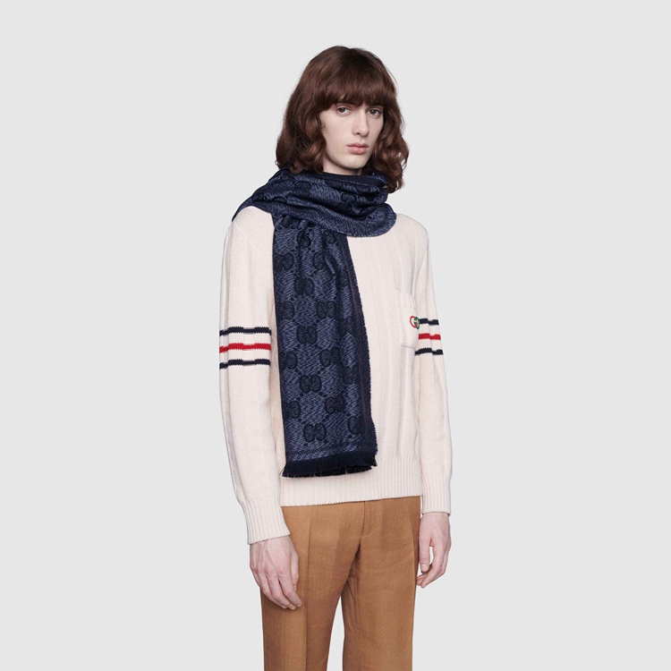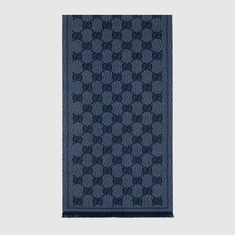 Style 625898 4G059 4068 Crafted from wool jacquard in contrasting shades of blue, This reversible scarf is defined by The House’s monogram. First used in The 1970s, The GG logo was an evolution of The original Gucci rhombi design from The 1930s, and from then it’s been an established symbol of Gucci’s heritage.