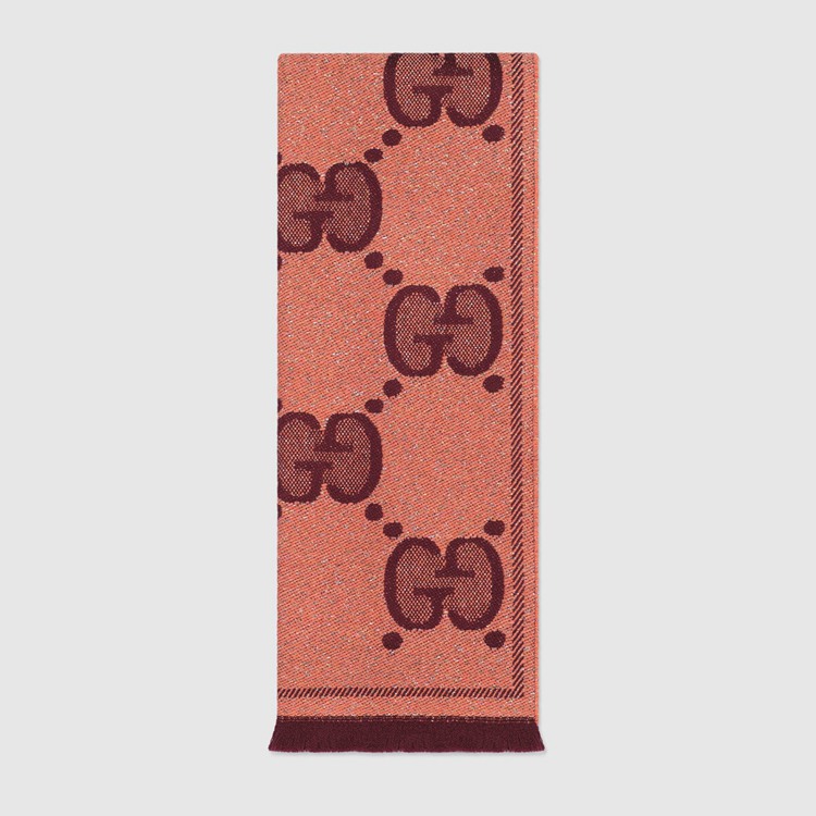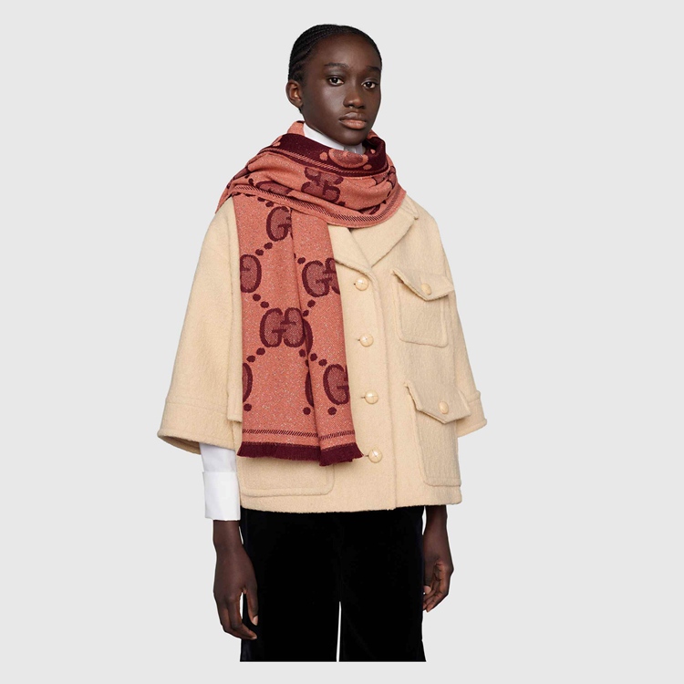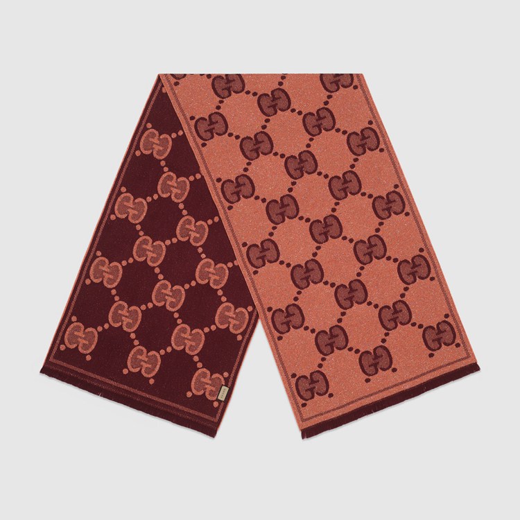 Style 598993 3GC15 7973Presented in a contrasting Color combination of pink and bordeaux, The initials of The Founder Guccio Gucci alternate across This wool jacquard scarf. Timeless pieces continue to elevate The House’s most Emblematic creations.