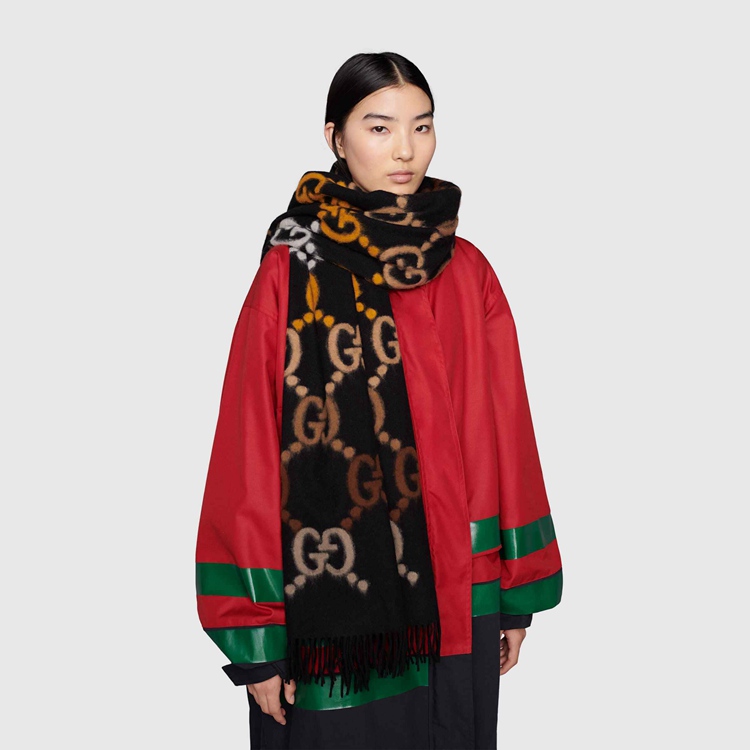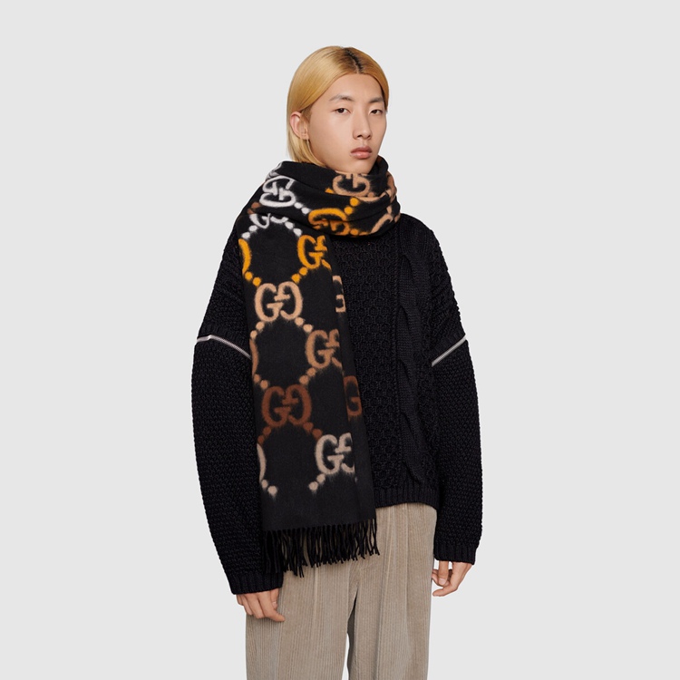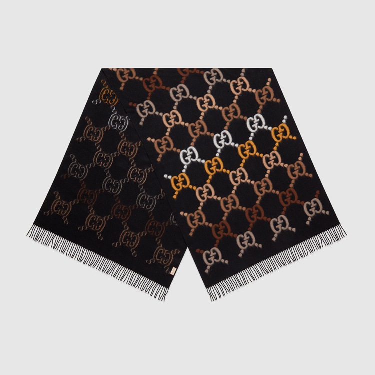 Style 675876 3G200 1064 The House’s most Emblematic symbols are continually reimagined in creative New ways. Here The GG motif, representative of Founder Guccio Gucci’s initials, appears as a brown detail on This black wool stole. The style is completed by tassel ends.