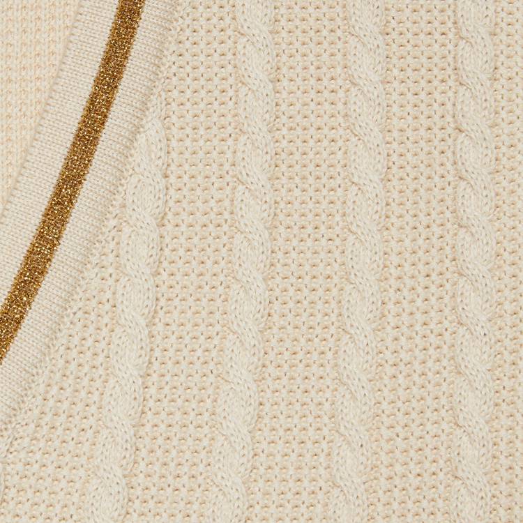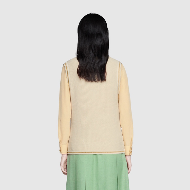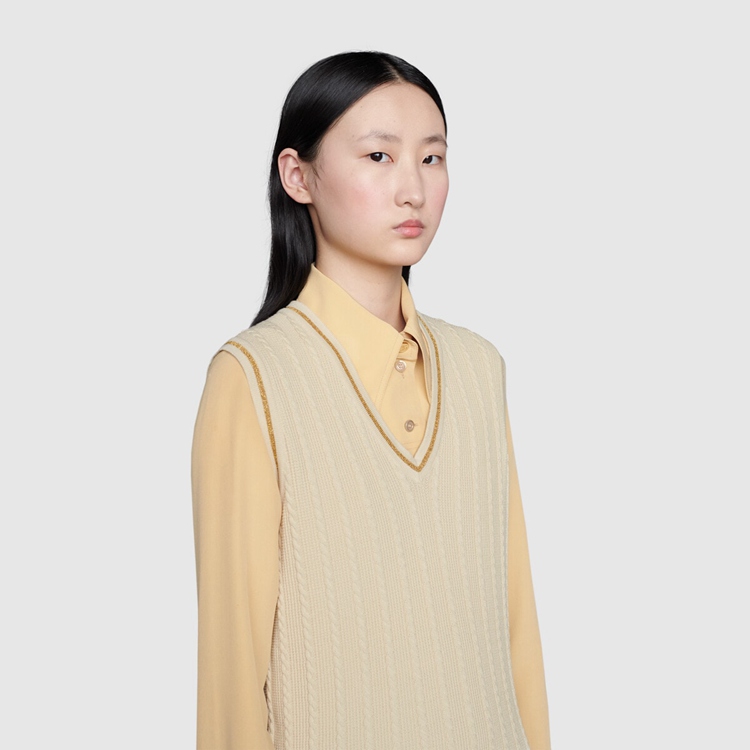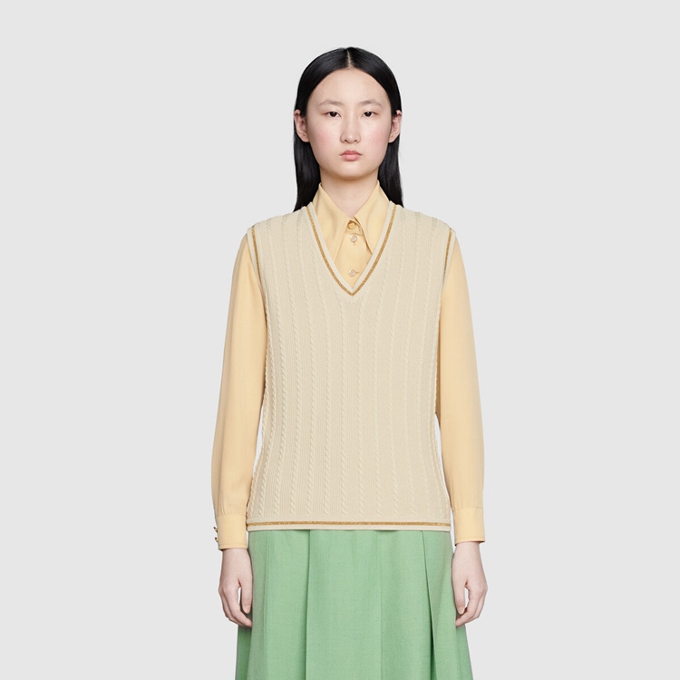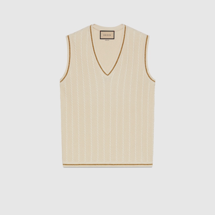Style 653334 XKBTA 9099 Classic knitwear Designs in sophisticated Color schemes are enriched by refined details and Emblematic House codes. Crafted from ivory fine cotton, This V-neck vest is enriched by gold lamé trims.
